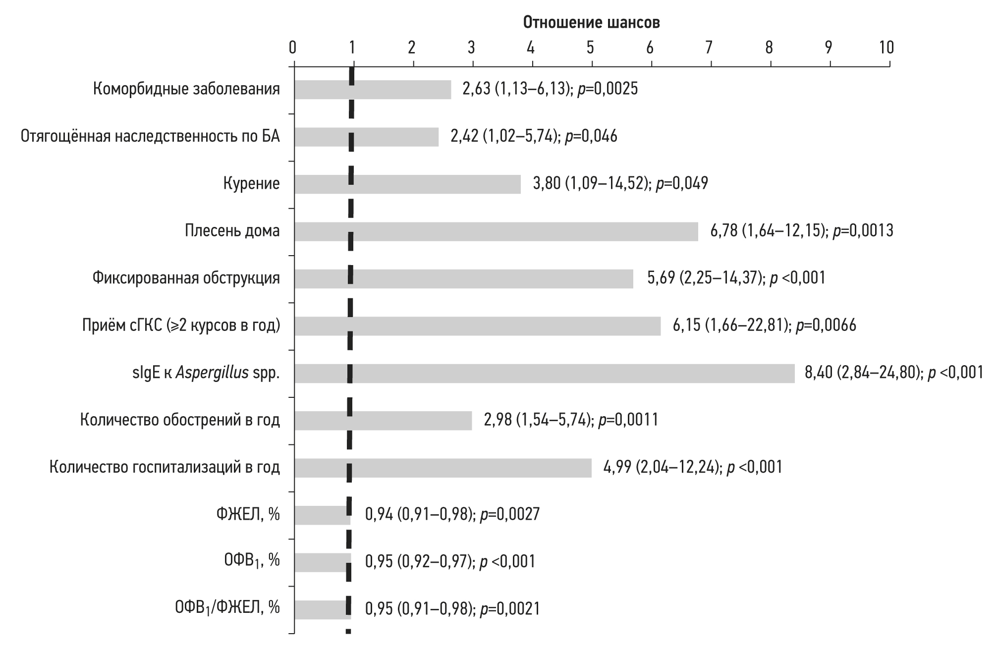 Выявление sIgE к A. fumigatus в сыворотке крови значимо понижает шансы контролируемого течения БА.