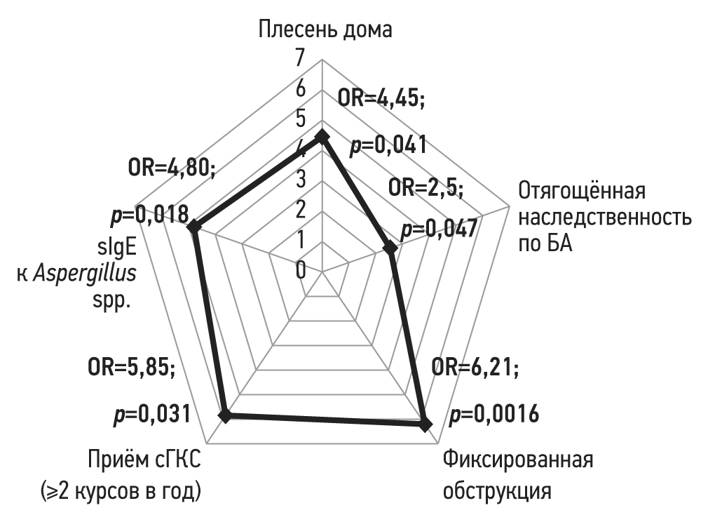 Несмотря на достигнутый в последнее время прогресс в лечении БА, изучение факторов, способных влиять на контроль и развитие тяжёлого течения заболевания, остаётся одной из самых обсуждаемых проблем современной медицины. Основу патогенеза БА составляет доминирование Т2-воспаления в дыхательных путях, важным диагностическим биомаркером которого являются sIgE в сыворотке крови. Наличие sIgE к A. fumigatus в сыворотке крови понижает шансы контролируемого течения тяжёлой БА в 8 раз. Кроме того, наиболее значимыми факторами риска неконтролируемого течения БА были фиксированная обструкция дыхательных путей, приём кортикостероидов системного действия, отягощённая наследственность по астме, контакт с плесневыми грибами в помещениях.