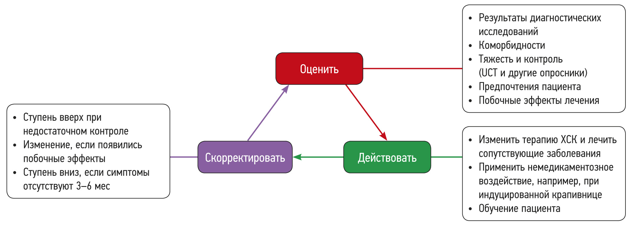 Рис. 2. Лечение хронической крапивницы: «оценить-действовать-скорректировать» [2]. / Fig. 2. Treatment of chronic urticaria: "assess-act-adjust" [2].