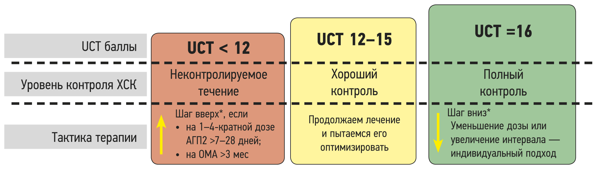Рис. 3. Хроническая крапивница: терапия и уровень контроля [2]. Примечание. * Для хронической индуцированной крапивницы индивидуальные решения основаны на предполагаемом воздействии триггера (например, холодовая крапивница зимой). ОМА ― омализумаб; Н1-АГП2 ― антигистаминный препарат 2-го поколения; UCT (urticaria control test) ― тест контроля крапивницы. / Fig. 3. Chronic urticaria: therapy and level of control [2]. Note. * For chronic induced urticaria individual decisions are based on estimated trigger exposure (e.g. cold-urticaria in winter). ОМА ― omalizumab; Н1-АГП2 ― 2nd generation H1-antihistamine; UCT ― Urticaria Control Test.