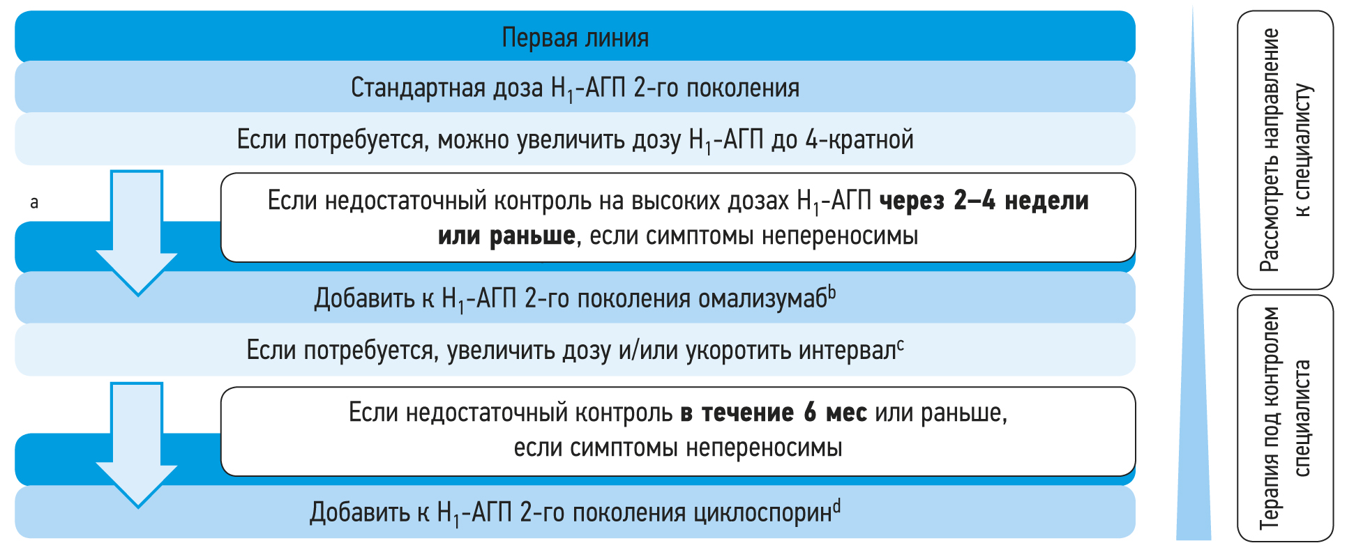 Рис. 4. Рекомендуемый алгоритм терапии крапивницы [2]. Примечание. Короткий курс системных глюкокортикоидов может быть назначен в случае тяжёлого обострения хронической крапивницы. a ― вторая и третья линии терапии относятся только к хронической крапивнице; b ― омализумаб в дозе 300 мг/каждые 4 нед; c ― омализумаб до 600 мг/каждые 2 нед; d ― циклоспорин до 5 мг/кг массы тела. / Fig. 4. Recommended treatment algorithm for urticaria [2]. Note: A short course of glucocorticosteroids may be considered in the case of severe exacerbation. a ― Second line and third line treatment apply only for CU; b ― Omalizumab 300 mg every 4 weeks; c ― Omalizumab up 600 mg every 2 weeks; d ― Cyclosporin up to 5mg/kg body weight.