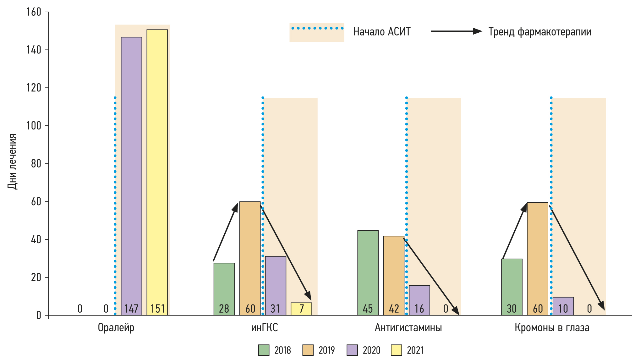 Эффект лечения в первый год применения оценён в 3 балла по 4-балльной шкале: симптомы поллиноза в сезон цветения 2020 г. отмечались значительно реже, и были существенно менее выражены, чем в предыдущие годы; во второй год лечения эффективность оценена в 4 балла: практически полное отсутствие симптомов поллиноза в сезон цветения 2021 г., отсутствие прогрессирования заболевания, значительное снижение потребности в фармакопрепаратах для купирования обострений. Так, в 2021 г. у пациента не отмечалось потребности в глазных каплях с кромогликатом натрия и пероральных антигистаминах, а применение интраназальных стероидов сократилось до 1 нед (в 8 раз короче, чем в 2019 г.) (рисунок).