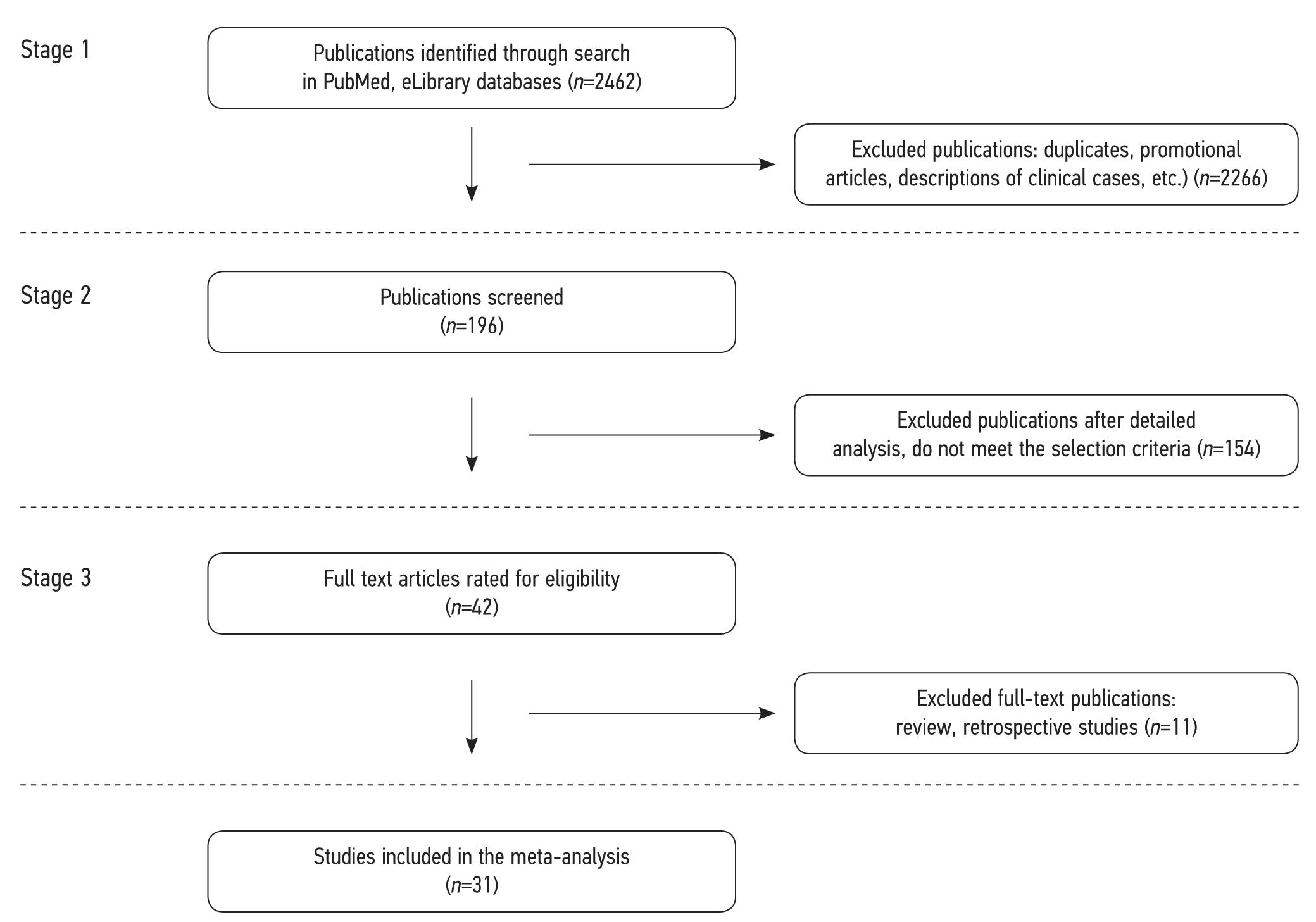 Stage 3. The authors conducted a detailed analysis of the full text of 196 publications after removing duplicates. Review publications, retrospective studies, comparative clinical studies, etc., were excluded at this stage.
