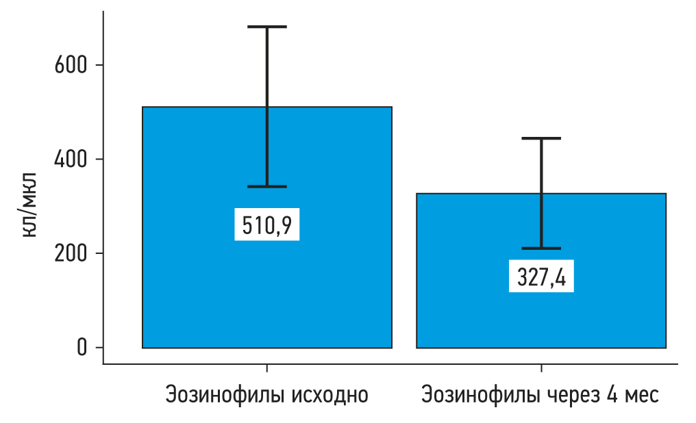 По числу эозинофилов в периферической (общей) крови нам удалось выявить статистически значимое снижение их количества в период до/через 4 мес, но на этапе анализа 4 и 12 мес статистически значимых изменений выявить не удалось из-за малой выборки, что считаем недостатком данного исследования.