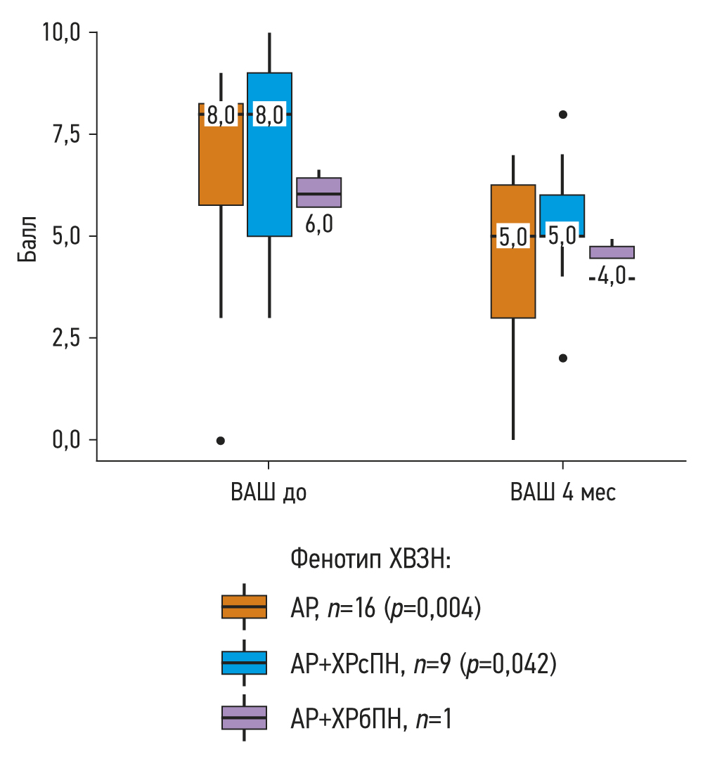 Оценка уровня контроля АР проводилась по шкале ВАШ исходно и спустя 4 мес терапии, без/с учётом фенотипа ХВЗН (АР, АР+ХРсПН, АР+ХРбПН). В группах без учёта ХВЗН (n=26) показатель ВАШ исходно составил 8 баллов, спустя 4 мес терапии омализумабом ― 5 баллов. С учётом фенотипирования в группах АР и АР+ХРсПН при оценке динамики ВАШ было установлено статистически значимое уменьшение показателя спустя 4 мес приёма анти-IgE-терапии (p=0,004 и p=0,042 соответственно) (используемый метод: критерий Уилкоксона), что свидетельствовало об улучшении контроля над симптомами АР. В группе АР средний показатель ВАШ до лечения составил 8 баллов (Q1–Q3: 5,0–8,2), спустя 4 мес от начала анти-IgE-терапии ― 5 баллов (Q1–Q3: 3,0–6,2); в группе АР+ХРсПН (n=26) отмечены аналогичные показатели ― 8 (Q1–Q3: 5,0–9,0) и 5 (Q1–Q3: 5,0–6,0) баллов соответственно; рис. 2.
