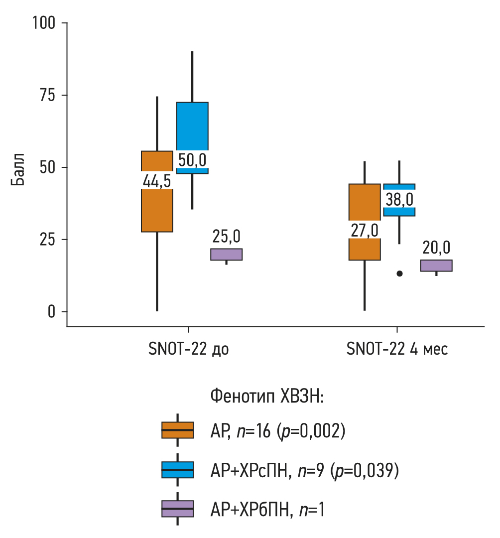 При оценке тяжести назальных симптомов и их влияния на качество жизни до анти-IgE-терапии и спустя 4 мес (n=26) с помощью опросника SNOT-22 было выявлено статистически значимое уменьшение степени тяжести симптомов (p <0,001) (используемый метод: парный t-критерий Стьюдента): исходно ― 46,85±22,04 баллов (95% ДИ 37,94–55,75), спустя 4 мес ― 30,65±14,81 баллов (95% ДИ 24,67–36,64). В группе пациентов с АР были выявлены статистически значимые изменения (p=0,002) (критерий Уилкоксона): исходно ― 44,5 баллов (Q1–Q3: 27,2–55,2), спустя 4 мес терапии ― 27 баллов (Q1–Q3: 17,5–44,0), что свидетельствовало об уменьшении тяжести симптомов АР и улучшении качества жизни пациентов. В группе АР+ХРсПН также были выявлены статистически значимые изменения (p=0,039) (используемый метод: критерий Уилкоксона): исходно ― 50 баллов (Q1–Q3: 47,0–72,0), спустя 4 мес терапии ― 38 баллов (Q1–Q3: 33,0–44,0), свидетельствующие об уменьшении тяжести симптомов АР и улучшении качества жизни пациентов (рис. 3).