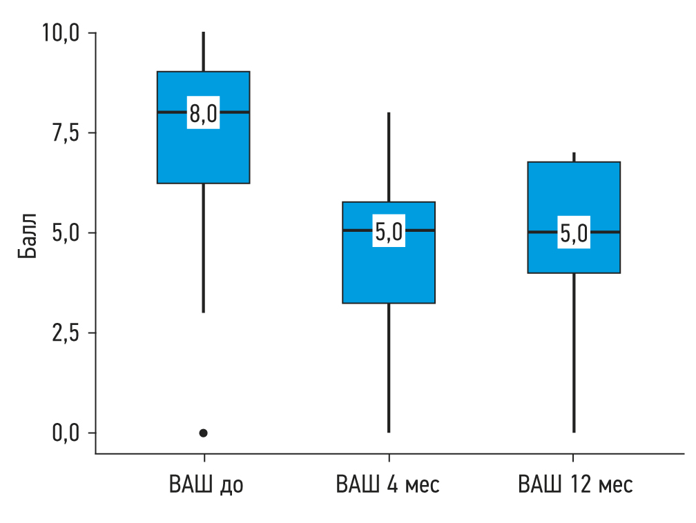 При анализе динамики показателей SNOT-22 и ВАШ «до-после» у пациентов без учёта фенотипа ХВЗН (n=18), имевших данные этих измерений через 12 мес, определялось существенное снижение количества баллов, что свидетельствует о снижении выраженности симптомов, связанных с АР, и характеризует улучшение качества жизни пациентов. Показатель ВАШ до терапии составлял 8 баллов (Q1–Q3: 6,2–9,0), спустя 4 мес терапии ― 5 баллов (Q1–Q3: 3,2–5,8), через 12 мес терапии ― 5 баллов (Q1–Q3: 4,0–6,8) (р=0,001); рис. 4.