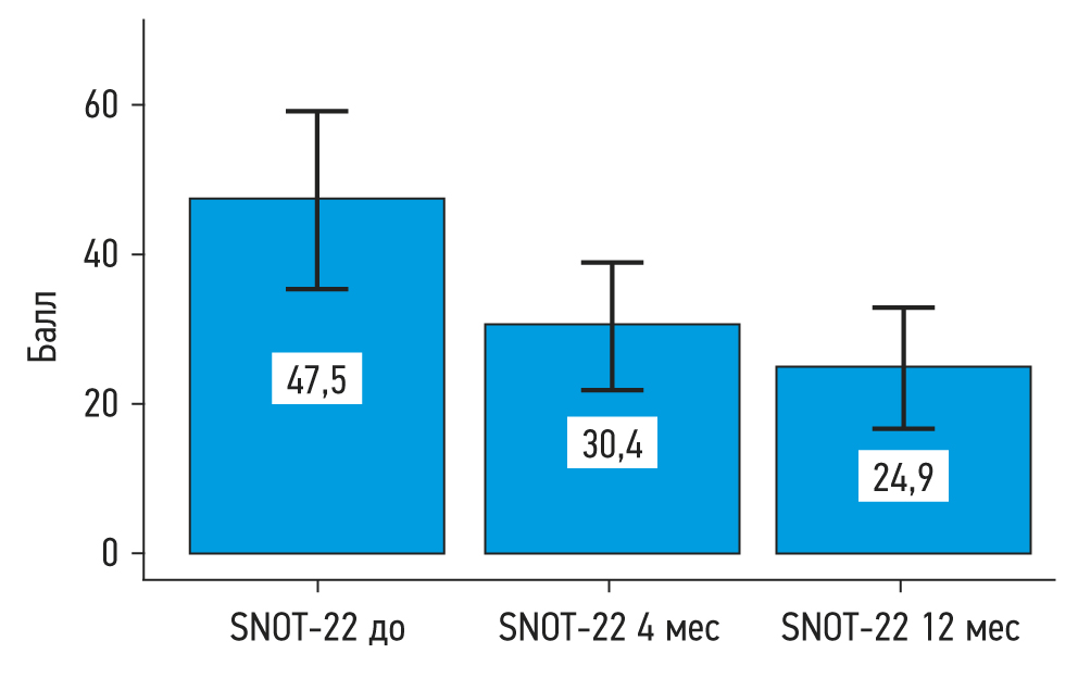 При оценке динамики по опроснику SNOT-22 было выявлено статистически значимое уменьшение степени тяжести симптомов (p <0,001) (используемый метод: критерий Фишера с повторными измерениями). SNOT-22 до терапии составлял 47,5 баллов (Q1–Q3: 35,7–59,3), спустя 4 мес терапии ― 30,4 баллов (Q1–Q3: 22,1–38,1), через 12 мес терапии ― 24,9 баллов (Q1–Q3: 16,9–32,9); рис. 5.