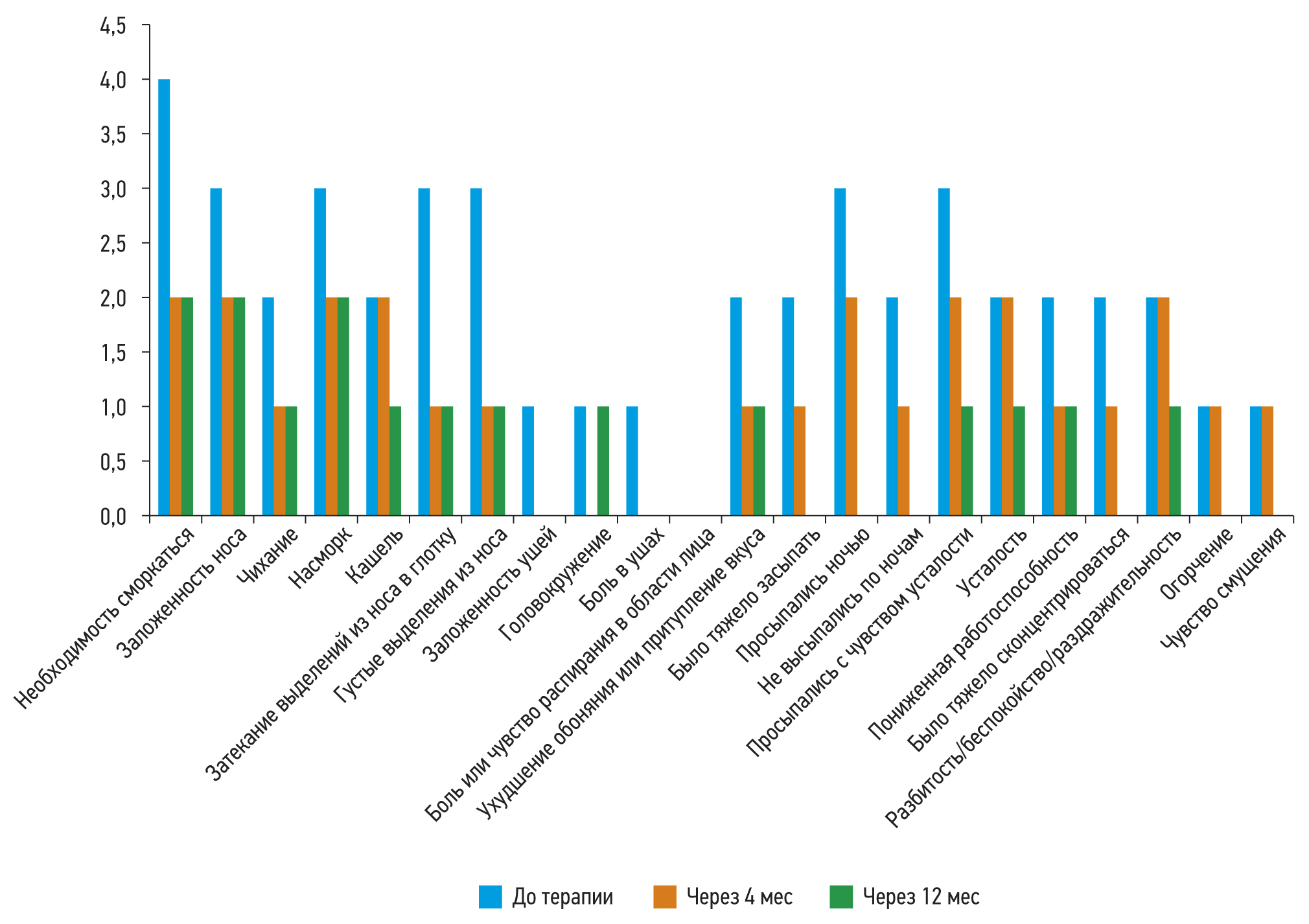 Рис. 6. Динамика симптомов хронического воспалительного заболевания носа по опроснику SNOT-22 за 12 мес, n=18.