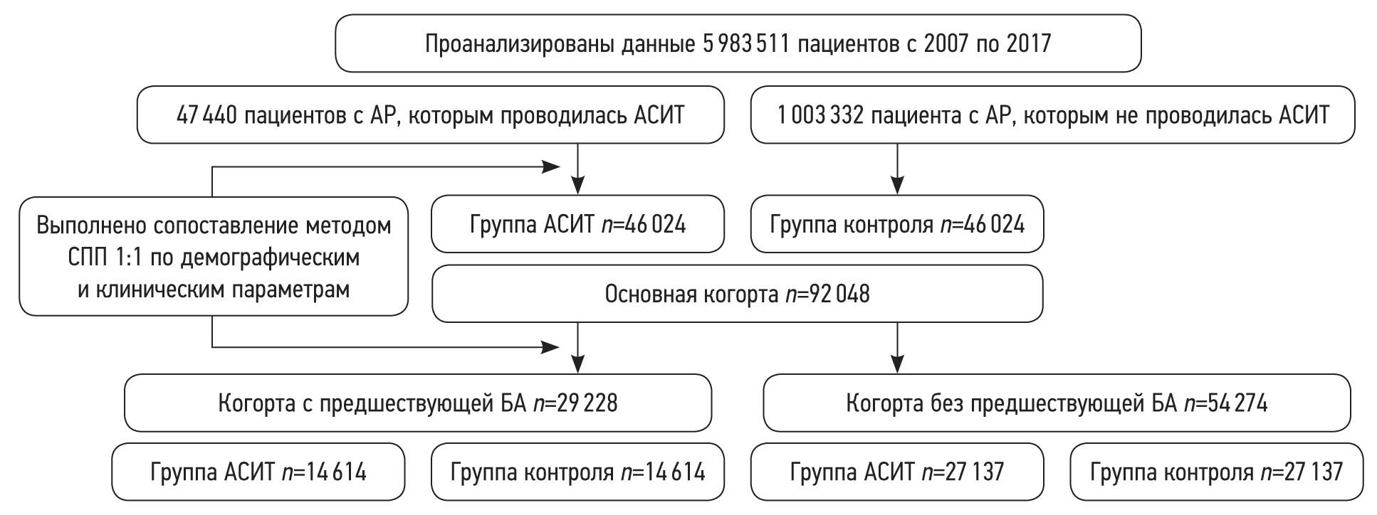 С целью оценки влияния АСИТ на БА из группы АСИТ и группы контроля основной когорты были выделены пациенты, имеющие БА до начала АСИТ. Получившиеся две подгруппы сравнивали друг с другом методом сопоставления показателей предрасположенности, после чего в подгруппы вошли по 14 614 пациентов (всего когорту пациентов с предшествующей БА составили 29 228 пациентов). Таким образом, в исследовании было сформировано три когорты пациентов ― основная и пациенты с/без БА на момент начала АСИТ, в свою очередь каждая из когорт подразделялась на группу АСИТ и группу контроля (рис. 1).