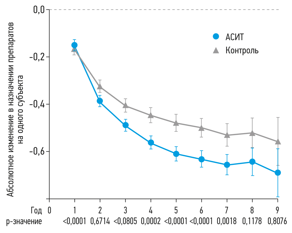 В ходе проведённого анализа были продемонстрированы важные результаты для клинической практики. Так, было показано, что проведение АСИТ ассоциировано с долгосрочным устойчивым снижением числа назначений медикаментов по поводу АР с тенденцией сохранения эффекта до 9 лет. Общее снижение в частоте назначений было сопоставимым для всех классов препаратов и более выраженным для антигистаминных препаратов в сравнении с интраназальными ГКС (рис. 2).