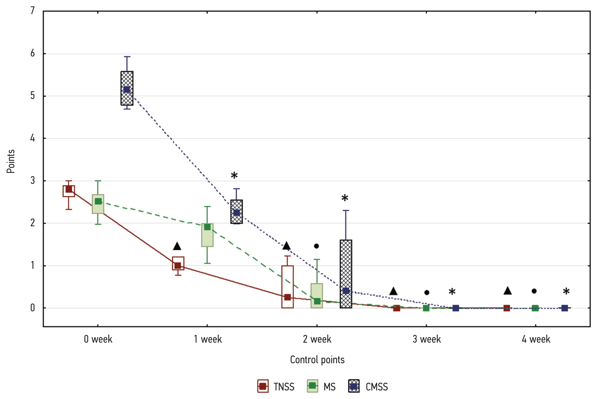 Fig. Change from baseline in Total Nasal Symptom Score (TNSS), medical score (MS), combined medical and symptom score (СМSS) due to omalizumab treatment, n=10. Note: *, regarding CMSS data prior to omalizumab treatment; •, regarding MS data prior to omalizumab treatment; , regarding TNSS data prior to omalizumab treatment. TNSS, Total Nasal Symptom Score; MS, medical score; CMSS, combined medical and symptom score. Data were described as Me [Q25%; Q75%] and Min–Max. Differences were considered statistically significant at p ≤0.05.