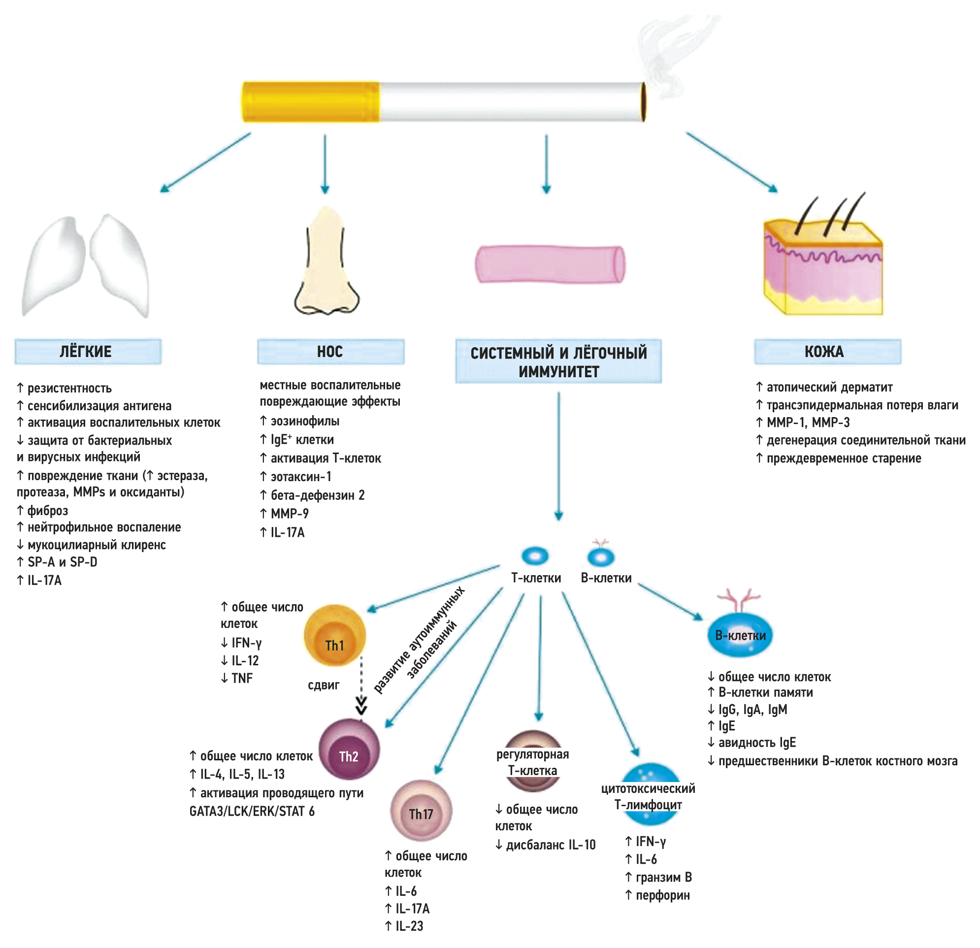 Эпителиальные клетки дыхательных путей активируются табачным дымом и продуцируют воспалительные медиаторы, включая фактор некроза опухоли альфа (TNF-α), интерлейкин-1b (IL-1b), гранулоцитарно-макрофагальный колониестимулирующий фактор (GM-CSF) и интерлейкин-8 (IL-8) [3]. Таким образом, воздействие табачного дыма на дыхательные пути способствует привлечению и активации воспалительных клеток. Среди курящих подростков, страдающих персистирующим аллергическим ринитом, было выявлено повышение количества эозинофилов в слизистой оболочке носа. У пациентов, подвергавшихся воздействию табачного сигаретного дыма, выявлено более высокое количество эозинофилов в слизистой носа в сравнении с аналогичным показателем у некурящих [5]. Кроме того, табачный дым активирует высвобождение из макрофагов воспалительных медиаторов (TNF-α, IL-1b, матриксных металлопротеиназ-2, -9, -12 и катепсинов K, L и S). Таким образом, табачный дым является мощным индуктором нейтрофильного воспаления. Воздействие табачного дыма вызывает синтез эпителиальными клетками дыхательных путей тимусного стромального лимфопоэтина (thymus stromal lymphopoietin, TSLP) ― известного активатора дендритных клеток, тем самым активируя иммунный ответ T-хелперных клеток 2-го типа (Th2-клетки). Следовательно, увеличение продукции TSLP является потенциальным механизмом, с помощью которого сигаретный дым может вызвать аллергическое воспаление в дыхательных путях. В моделях на мышах было показано, что кратковременное воздействие дыма усиливает опосредованный дендритными клетками транспорт аллергенов клещей домашней пыли в лимфатические узлы и генерирует локальный ответ Thвысив-клеток. Воздействие табачного дыма увеличивает количество В-клеток в дыхательных путях и снижает количество В-клеток памяти в периферической крови, подавляет секрецию иммуноглобулинов (Ig) классов A, G и M, но может увеличивать выработку IgE (рисунок), что, возможно, способствует развитию аллергических заболеваний [3].