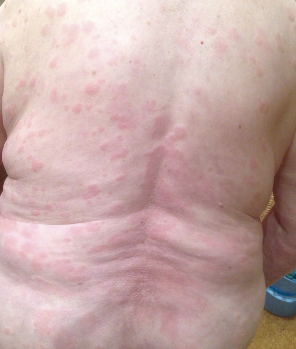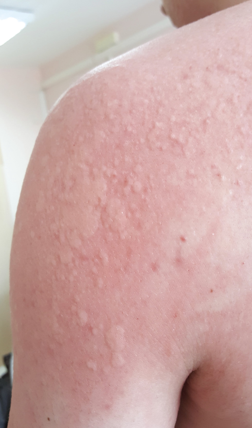 Fig. 1. Urticaria caused by Tempalgin. Multiple wheals of various sizes on erythematous background. (Photo from authors’ archive).