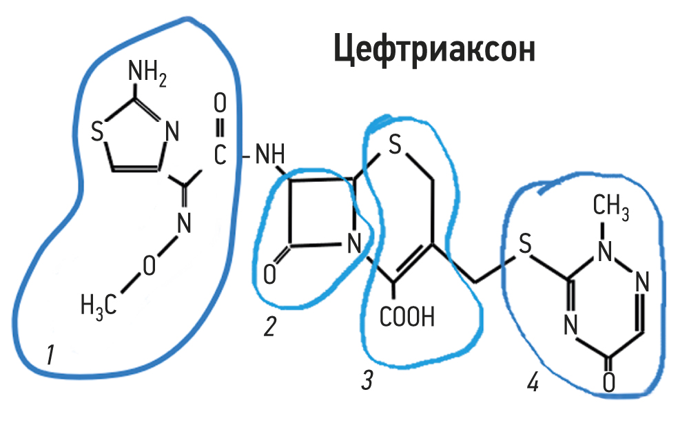 Рис. 1. Структурная формула цефтриаксона: 1 ― R1-цепь; 2 ― четырёхчленное бета-лактамное кольцо; 3 ― дигидротиазиновое кольцо; 4 ― R2-цепь.