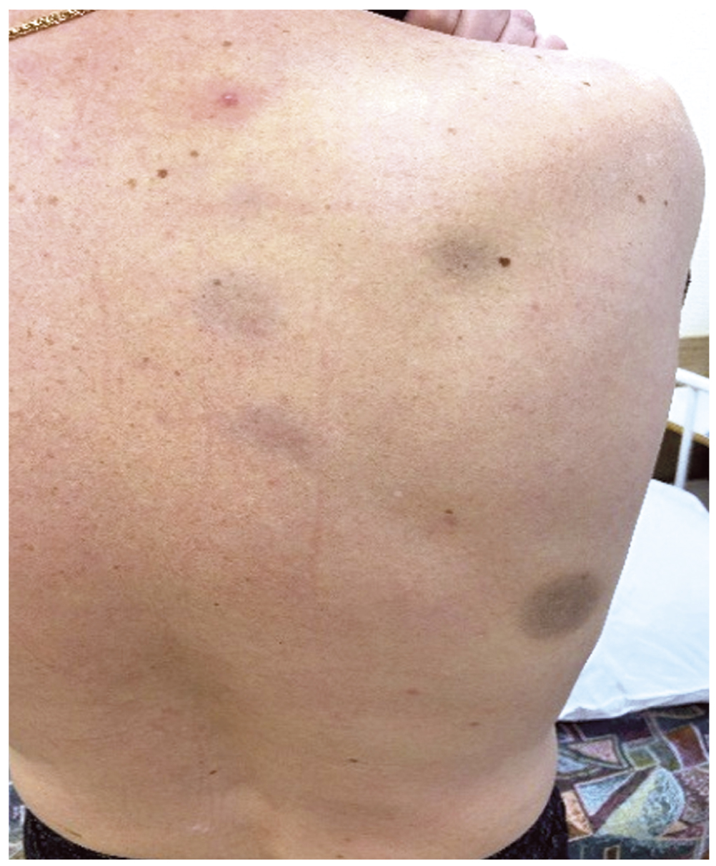 Рис. 2. Пациент Р., 38 лет, диагноз общей вариабельной иммунной недостаточности. Реакция на введение цефтриаксона внутримышечно: высыпания на коже серовато-фиолетового цвета, округлой формы, размером от 1 до 3 см в диаметре, без зуда.