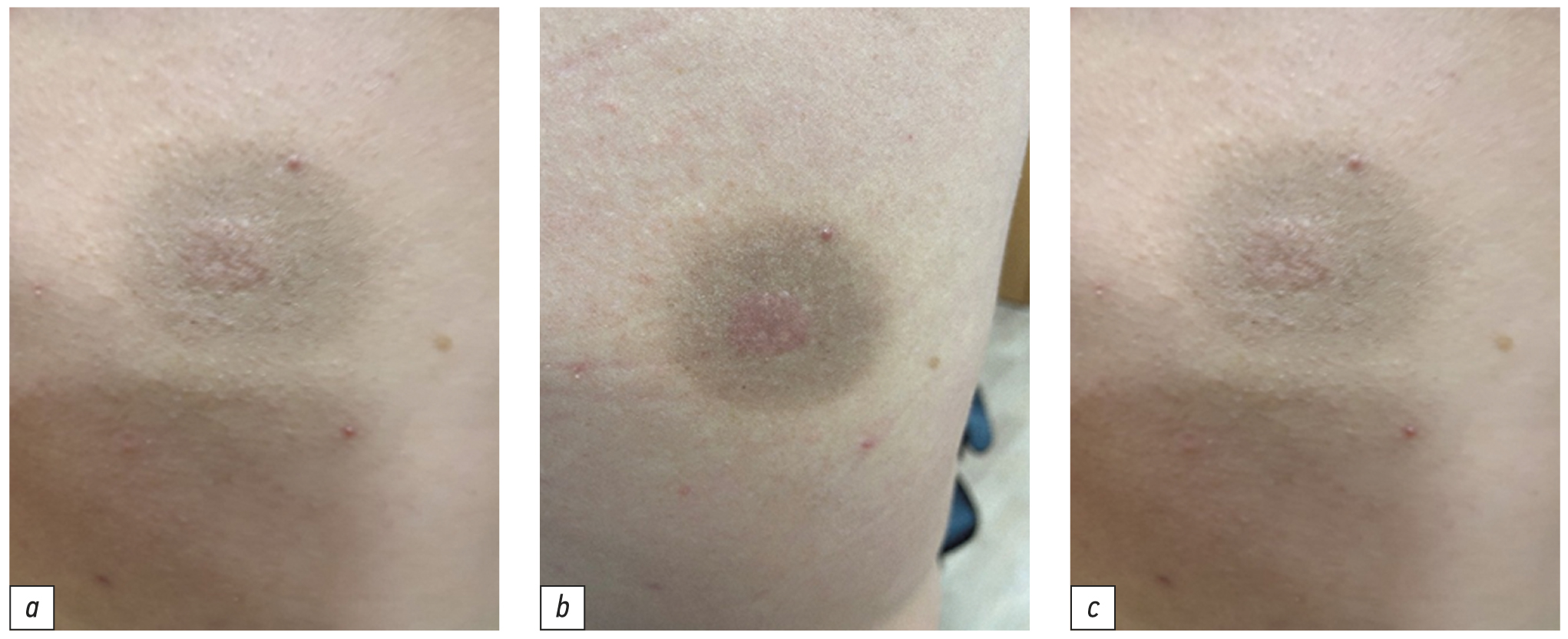 Рис. 3. Тот же пациент. Результаты внутрикожного тестирования с цефтриаксоном непосредственно в пятно на коже спины: a ― оценка результата через 2 ч: гиперемия, папула в области поствоспалительного пятна; b ― оценка результата через 6 ч: в области поствоспалительного пятна сохраняются гиперемия и папула; c ― оценка результата через 12 ч: в области поствоспалительного пятна сохраняются гиперемия и папула.