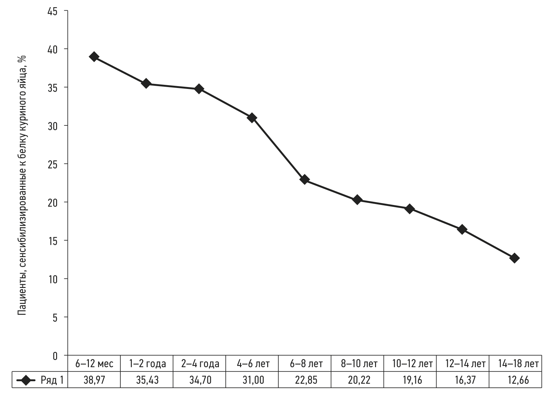 Для данного типа пищевой аллергии характерны спонтанное разрешение заболевания у пациентов и развитие толерантности на белок куриного яйца с возрастом [2]. Однако у части детей, не развивших толерантность, сохраняются выраженные клинические проявления аллергии во взрослом возрасте (рвота, боль в животе, диарея, крапивница), что значительно ухудшает качество их жизни, а также увеличивает риск жизнеугрожающих реакций [3]. Согласно данным многолетних проспективных исследований, латентная сенсибилизация (т.е. выявление в сыворотке крови пациента аллергенспецифических IgE при отсутствии клинических проявлений аллергии) во многих случаях предшествует развитию аллергического заболевания в последующей жизни [12, 13].