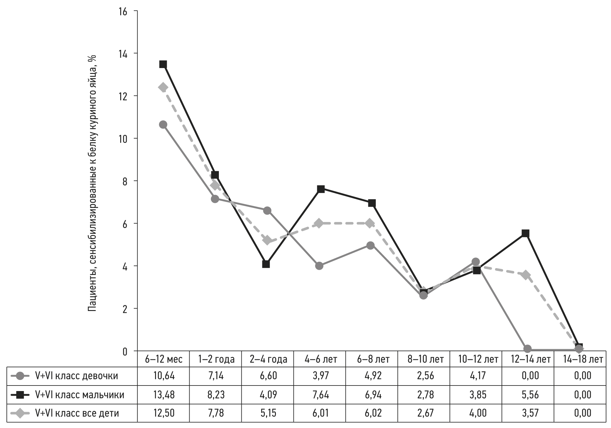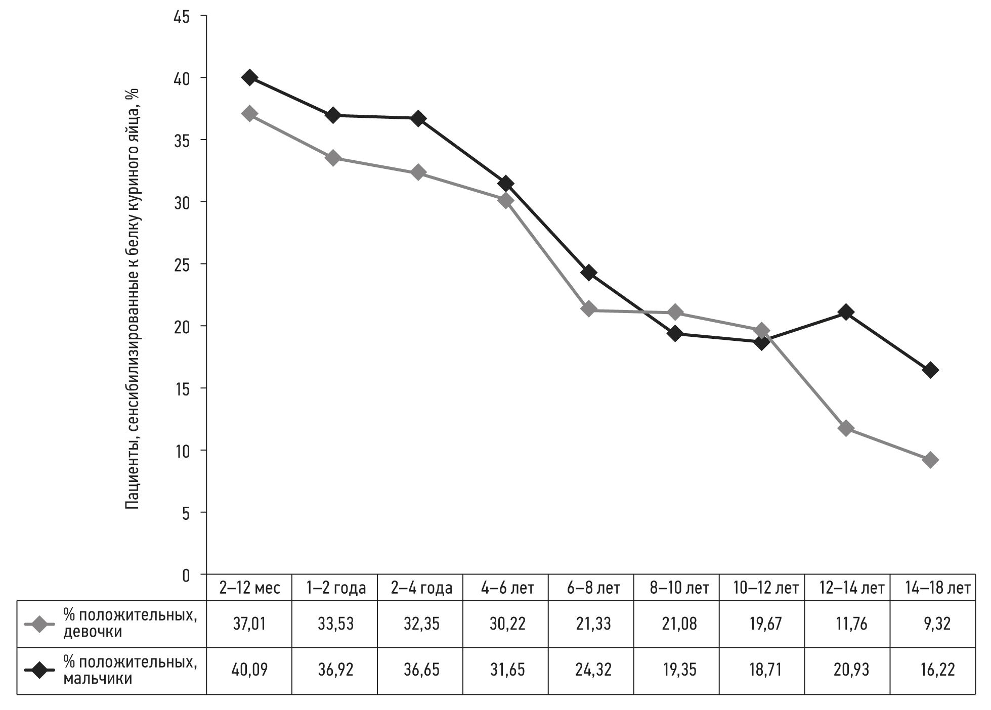 У мальчиков первого года жизни исследованные IgE-антитела выявлены в 40,1% случаев, а к возрасту 4–6 лет это значение снижалось до 31,7%. В возрастном периоде 6–12 лет частота выявления сенсибилизации снизилась до 18–24%. В отличие от девочек, у мальчиков 12–14 и 14–18 лет частота сенсибилизации была в 1,5–2 раза выше. К 14–18 годам 16,2% мальчиков имели IgE к экстракту аллергенов белка куриного яйца.