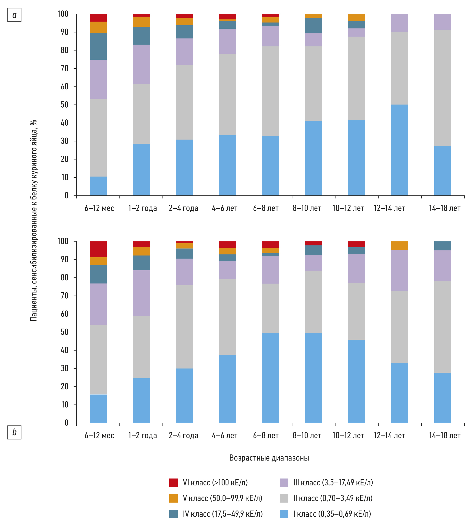 Нами проанализированы все амбулаторные карты пациентов с диагнозом пищевой аллергии, прошедших обследование и лечение в ФГАУ «НМИЦ здоровья детей». Иммунологическое обследование пациентов было проведено методом непрямой иммунофлуоресценции (анализатор Phadia250, Thermo Fisher Scientific, США) в соответствии с инструкцией производителя тест-системы. У всех пациентов был определён уровень иммуноглобулинов класса Е (IgE) к экстракту аллергенов белка куриного яйца. Результат тестирования считался положительным (уровень антител клинически значимым) при концентрации IgE ≥0,35 кЕ/л. В интерпретации полученных результатов использовалось также разделение их на классы сенсибилизации согласно данным производителя тест-системы. Так, при концентрации 0,01–0,34 кЕ/л уровень антител изотипа IgE считался диагностически незначимым (0-й класс); при концентрации антител, равной 0,35–0,69 кЕ/л, уровень антител соответствовал слабой сенсибилизации (I класс); при концентрации антител 0,70–3,49 кЕ/л сенсибилизация пациента считалась умеренной (II класс); концентрация антител 3,5–17,49 кЕ/л соответствовала среднему уровню сенсибилизации (III класс), 17,5–49,9 кЕ/л ― высокому уровню (IV класс), 50,0–99,90 кЕ/л ― очень высокому уровню (V класс), более 100 кЕ/л ― предельно высокому уровню сенсибилизации (VI класс).
