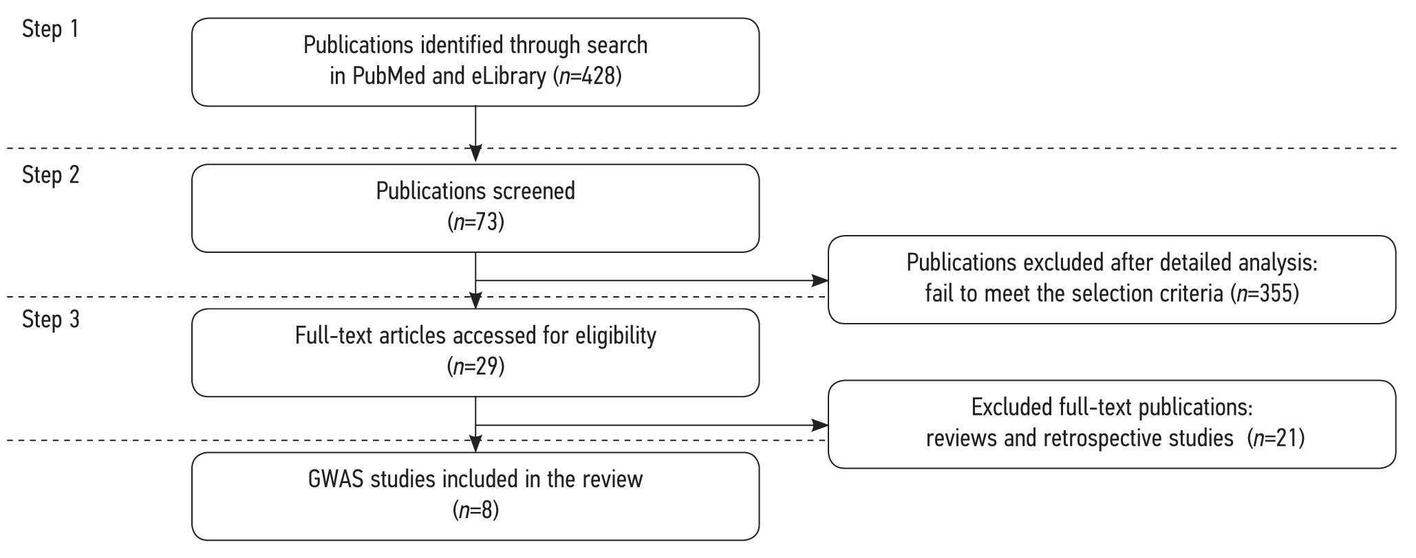 In the second stage, data of publications obtained during the initial search were analyzed; 355 papers that did not contain data on genetic markers associated with FA development and duplicates were excluded. No articles in the Russian language matched the search criteria. Finally, 73 publications have been selected for further analysis at this stage.