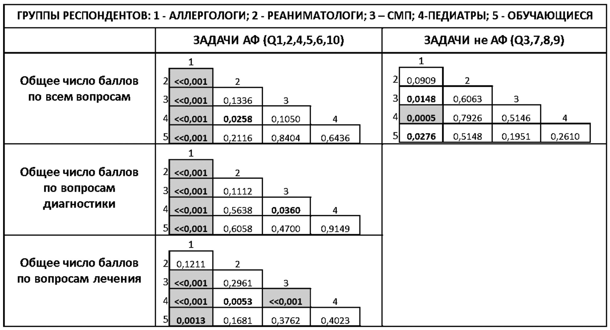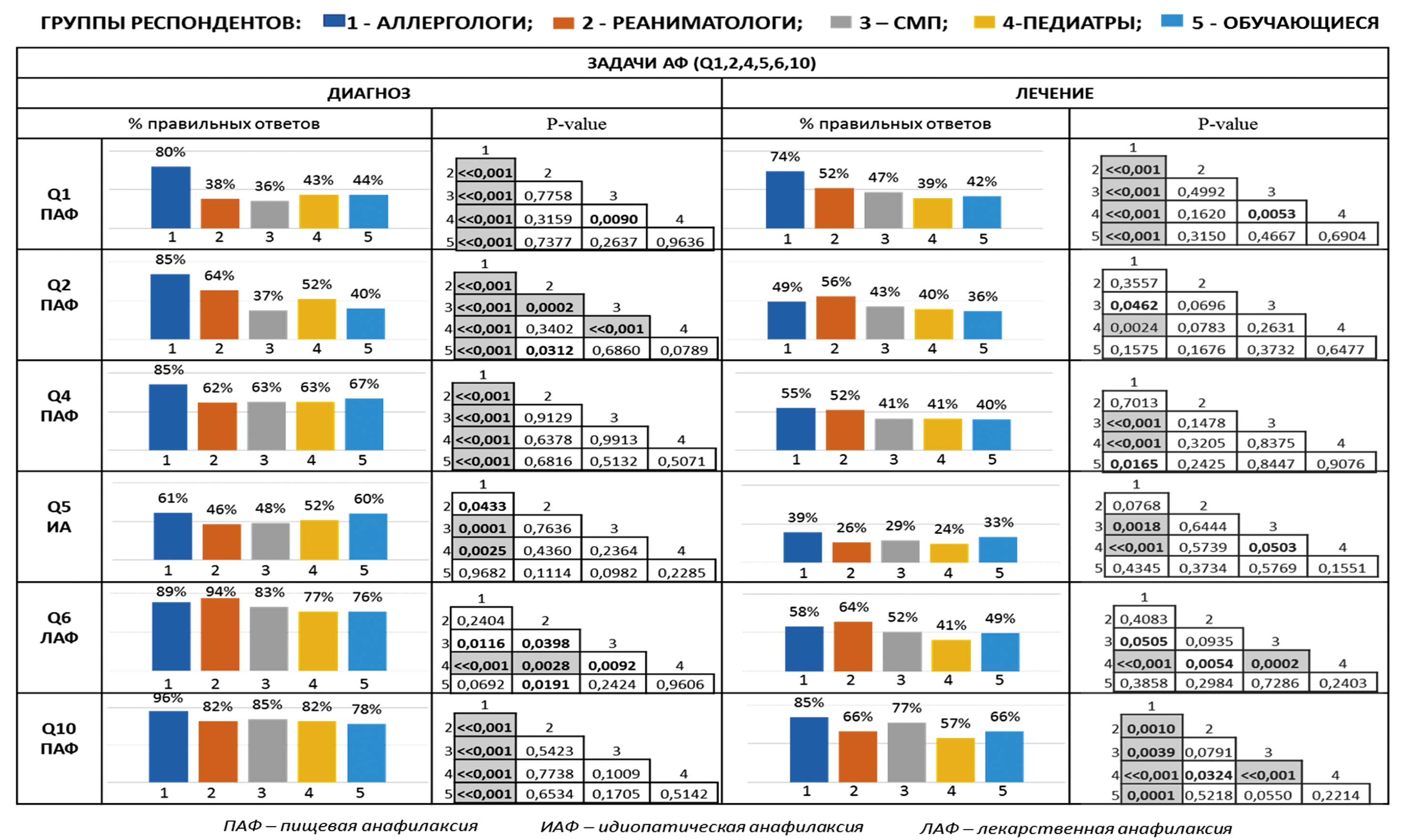 Рис. 3. Частота правильных ответов и статистическая значимость различий между группами отдельно для каждой задачи по диагностике и лечению анафилаксии (Q1,2,4,5,6,10). Жирный шрифт ― p <0,05; жирный шрифт с выделением серым цветом ― p <0,005 (пороговый уровень значимости с учётом поправки Бонферрони).