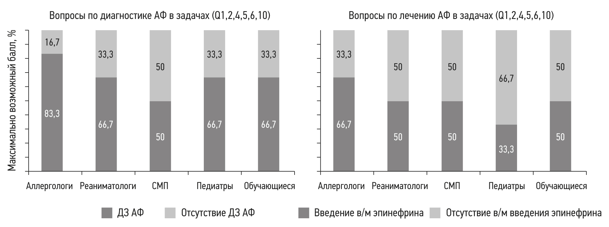 В целом, исходя из процента набранных баллов от максимально возможных по вопросам диагностики и лечения АФ (Q1,2,4,5,6,10), во всех группах респондентов прослеживалась более высокая частота постановки диагноза АФ в сравнении с более низкой частотой внутримышечного назначения эпинефрина (рис. 2). Наиболее убедительные межпрофессиональные отличия продемонстрировали педиатры, которые выставляли диагноз АФ в 66,7% случаев, при этом эпинефрин назначали только в половине из них. Доля неправильных ответов в виде гиподиагностики АФ среди аллергологов была самой низкой ― 16,7%, а среди врачей скорой медицинской помощи ― максимальной и достигала 50%. Процент неправильных ответов в виде отсутствия внутримышечного введения эпинефрина среди аллергологов был минимальным и составлял 33,3%, среди реаниматологов, врачей скорой медицинской помощи и обучающихся ― 50%, среди педиатров ― 66,7%.