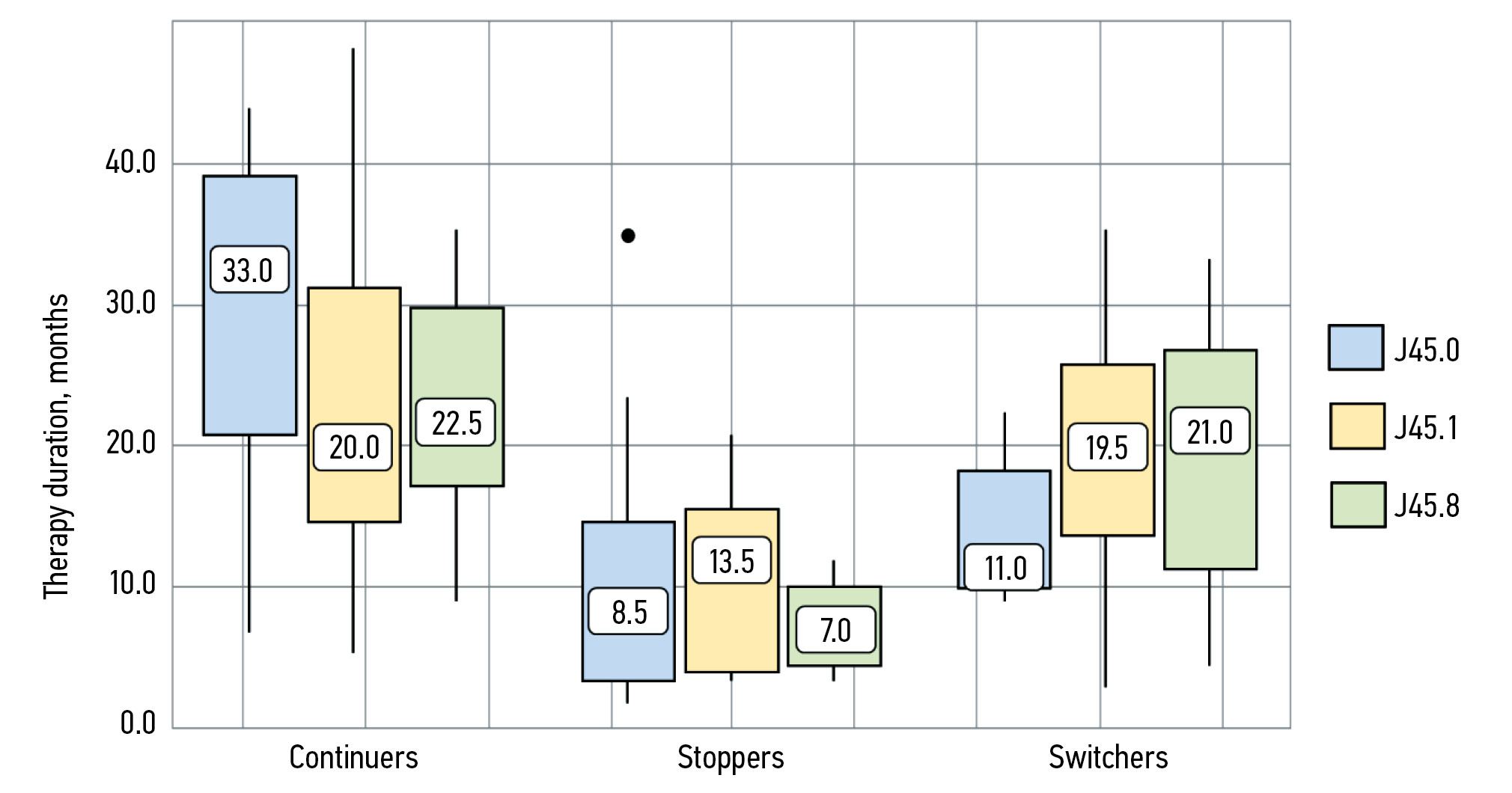 Peripheral blood eosinophils, cells/µL, Me (Q1–Q3) | 489.00 (299.50–874.00) | 466.50 (284.50–755.75) | 390.50 (239.50–536.00) | 881.50 (619.25–1249.50) | 0.005* pSwitchers–Continuers=0.006 pSwitchers–Stoppers=0.006 |