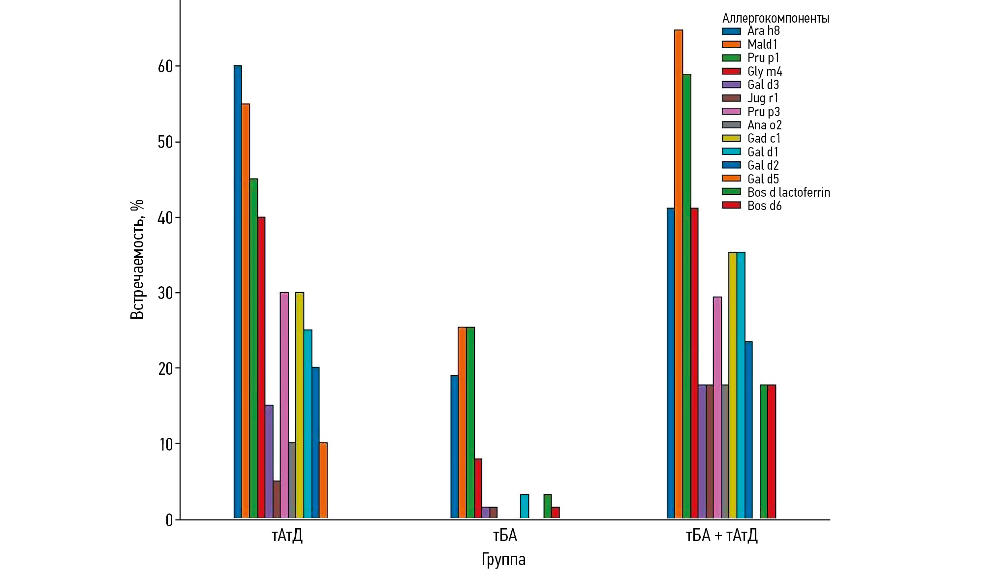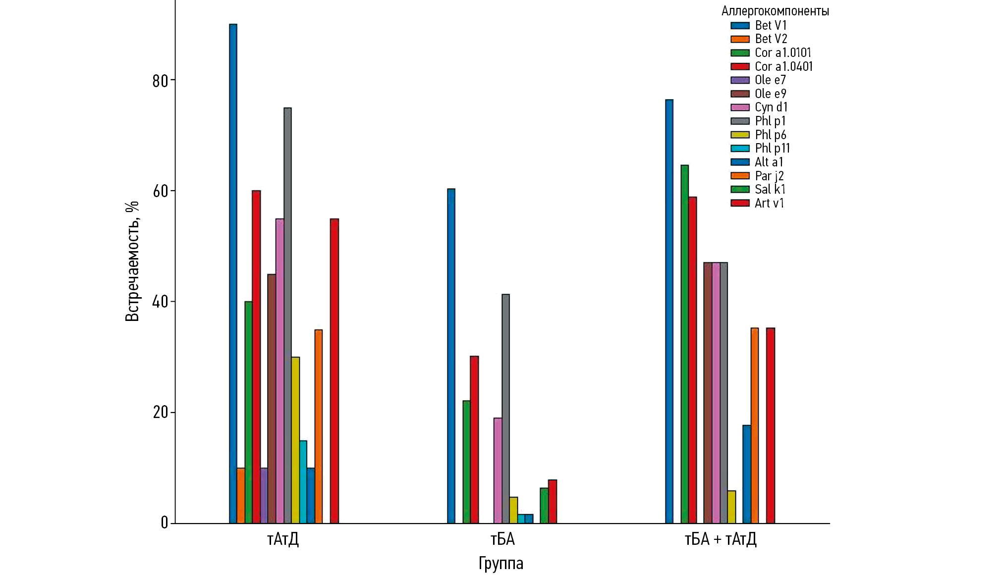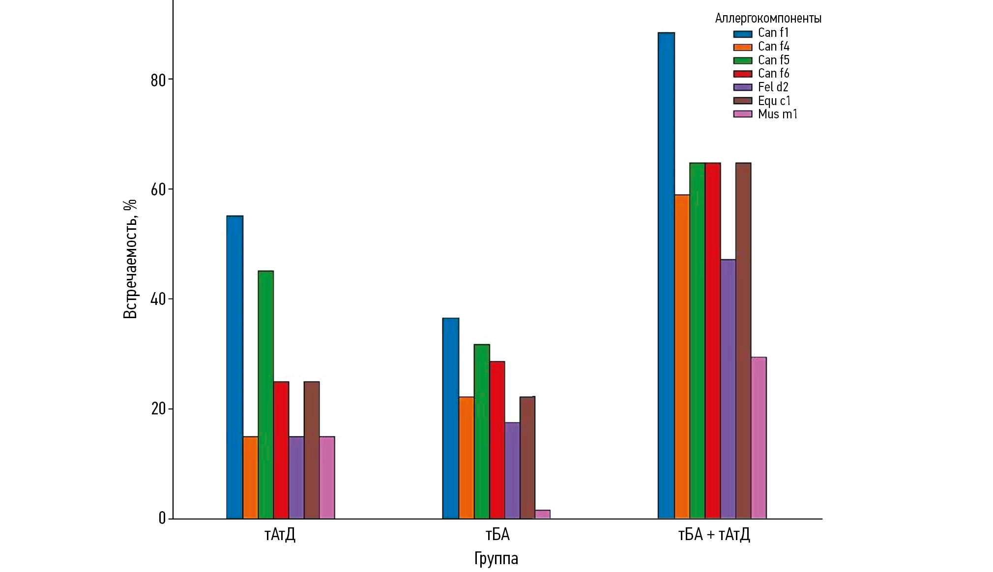Аллергокомпонентная диагностика является точным и информативным анализом, позволяющим расширить диагностические возможности с целью определения индивидуального спектра сенсибилизации; его результат может предсказать риск развития тяжёлой аллергической реакции и обеспечить своевременное проведение соответствующего лечения. У пациентов с тБА и тАтД преобладает сенсибилизация к пыльцевым и эпидермальным аллергенам, в группах больных АтД обращают на себя внимание полисенсибилизация и распространённость грибковой и пищевой аллергии. Степень влияния бытовой сенсибилизации, вопреки существующим данным, в нашей когорте пациентов неоднозначна.