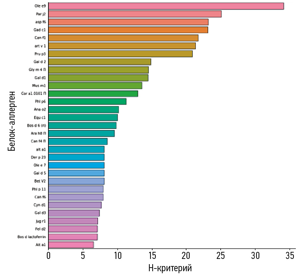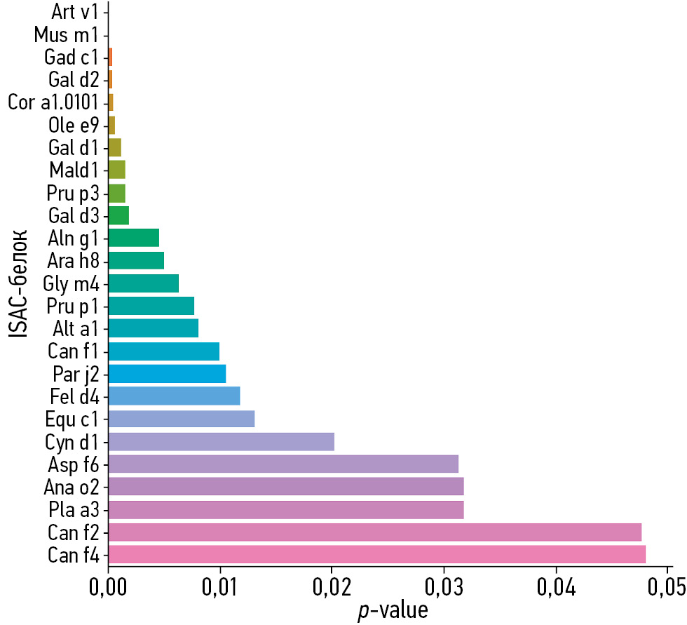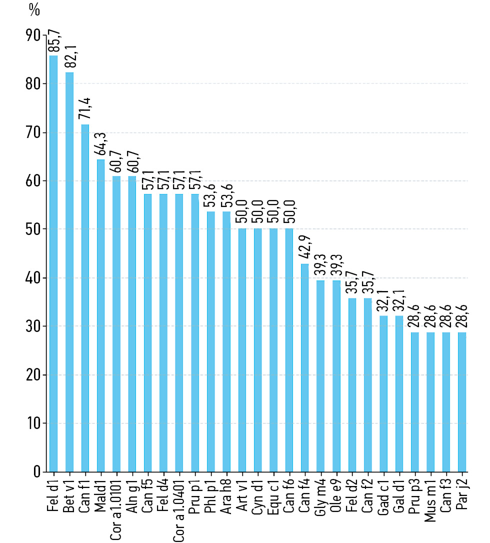 При проведении молекулярной диагностики проводили оценку статистической значимости различных компонентов аллергенов категориальным способом. При выявлении уровня аллергокомпонента в сыворотке выше 0,3 ISU-E (стандартизованных единиц) регистрировали наличие сенсибилизации, ниже 0,3 ISU-E ― её отсутствие.