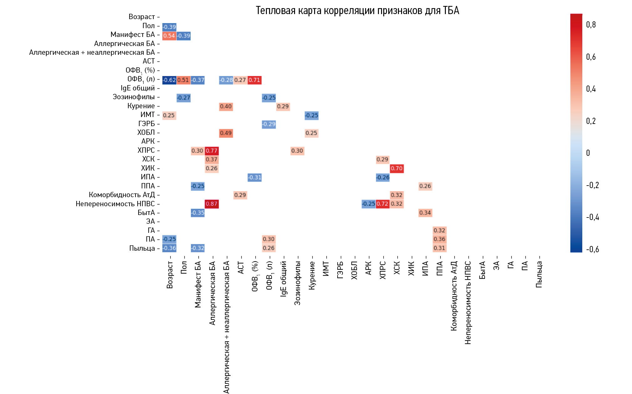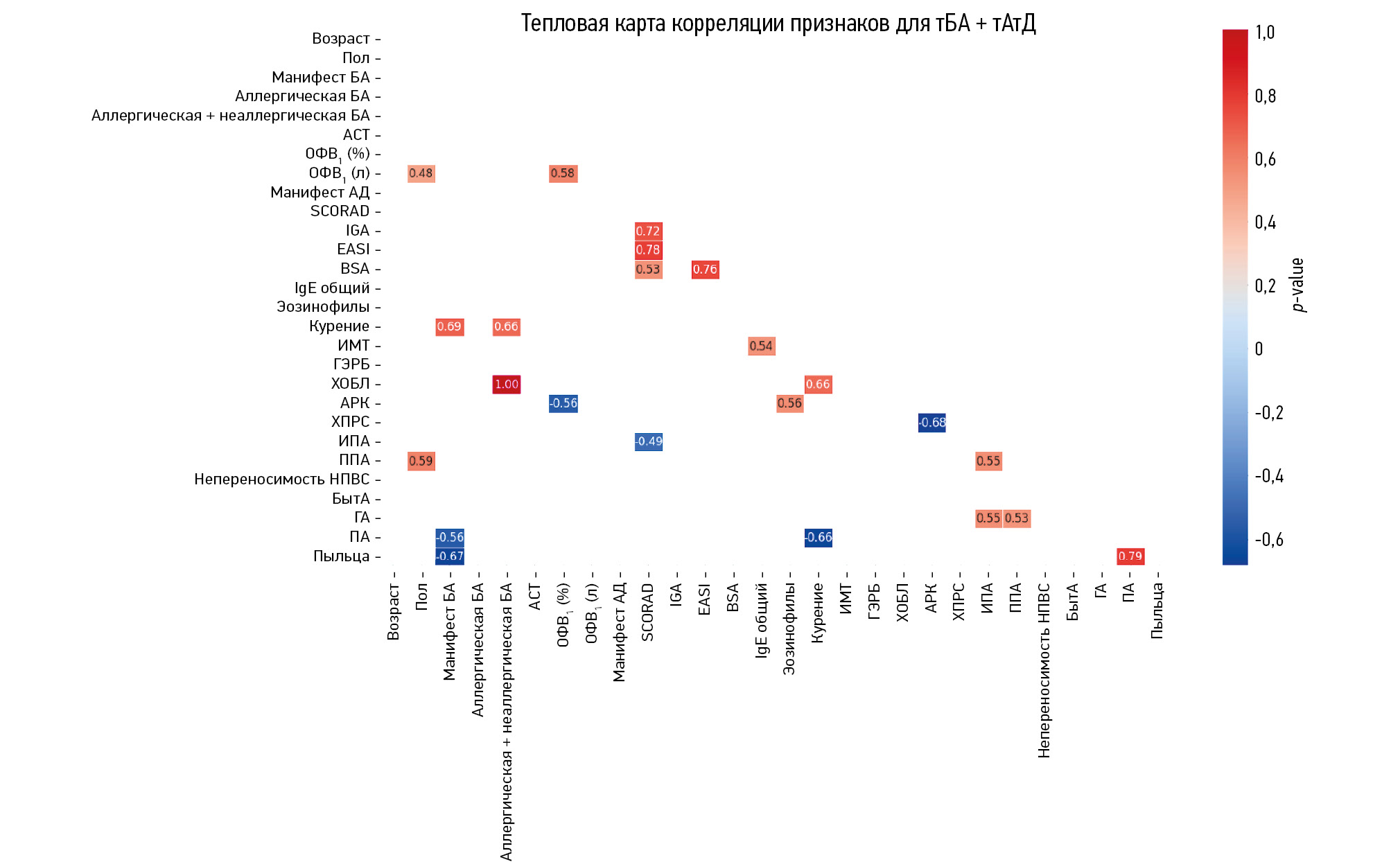 Производили оценку наличия сопутствующих T2-заболеваний: аллергического риноконъюнктивита (АРК); коморбидного АтД в группе тБА; коморбидной БА в группе тАтД; хронического полипозного риносинусита (ХПРС), пищевой аллергии, включая перекрёстную. Проводили также анализ распространённости сопутствующей патологии: гастроэзофагеальной рефлюксной болезни (ГЭРБ), хронической обструктивной болезни лёгких (ХОБЛ), непереносимости нестероидных противовоспалительных препаратов (НПВС).