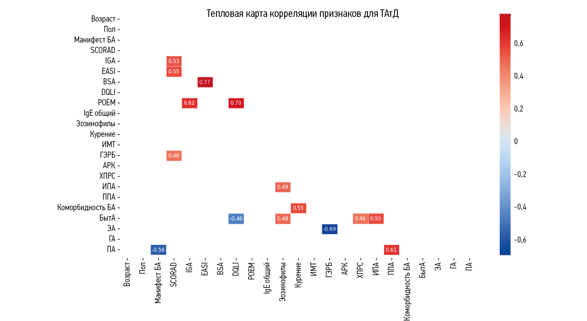 Значительная связь между тяжестью АтД и наличием сенсибилизации к пищевым аллергенам отмечена в нескольких публикациях. Примерно 30% детей с АтД имеют сопутствующую пищевую аллергию [34]. Некоторые исследования показывают, что до 96% пациентов с тБА страдают от реакций на пищевые продукты [8, 35], при этом в группе 2 нами найдена корреляция между эозинофилией и пищевой аллергией. В прошлом нашем исследовании было показано, что на высокую распространённость пищевой аллергии у пациентов с АтД может влиять грибковая сенсибилизация [36]. По данным настоящего исследования, в группе 3 также существует прямая корреляция между сенсибилизацией к грибковым аллергенам и пищевой аллергией (r=0,549; p=0,022), в том числе с перекрёстной пищевой аллергией (r=0,528; p=0,029), что свидетельствует о возможном усугублении повреждения кожного барьера под воздействием грибковой флоры.
