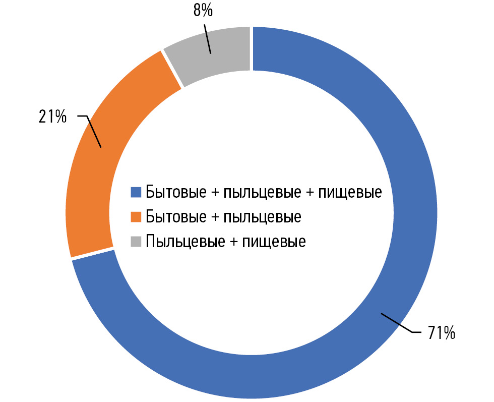 У 90% больных выявлена сочетанная сенсибилизация к пыльцевым, бытовым и пищевым аллергенам, у 6% ― моносенсибилизация к аллергенам злаковых трав (тимофеевка луговая, мятлик луговой), у 4% ― к аллергенам сорных трав (полынь обыкновенная, лебеда).