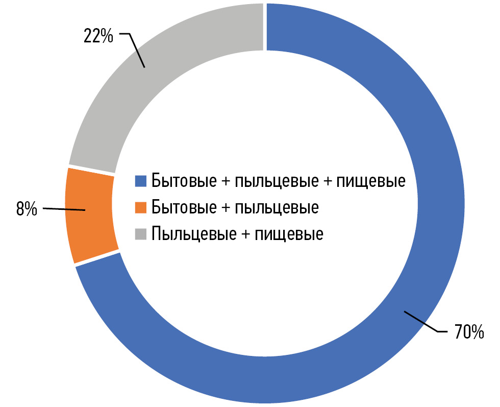 По данным журналов диагностики и индивидуальных диагностических карт оценены результаты аллергологического обследования 100 пациентов, включавшего метод кожного тестирования (prick-тесты) с водно-солевыми экстрактами аллергенов производства «НПО «Микроген» (Россия) и лабораторную диагностику ― определение специфических иммуноглобулинов Е (sIgE) к бытовым, пыльцевым, пищевым аллергенам методом иммуноферментного анализа с использованием диагностических наборов производства «Алкор Био» (Россия). Для кожного тестирования применяли диагностические аллергены клещей домашней пыли, пыльцевые аллергены (тимофеевка луговая, мятлик луковичный, полынь обыкновенная, лебеда); in vitro исследовали уровень аллергенспецифических IgЕ к экстрактам пищевых аллергенов ― коровьему молоку, глютену, яичному белку, смеси аллергенов орехов ― фундуку, миндалю, кокосу, арахису, грецкому ореху; к клещам домашней пыли (d1 ― Dermatophagoides pteronyssinus, d2 ― Dermatophagoides farinae), а также уровень микст-аллергенов из пыльцы луговых и сорных трав в сыворотке крови.