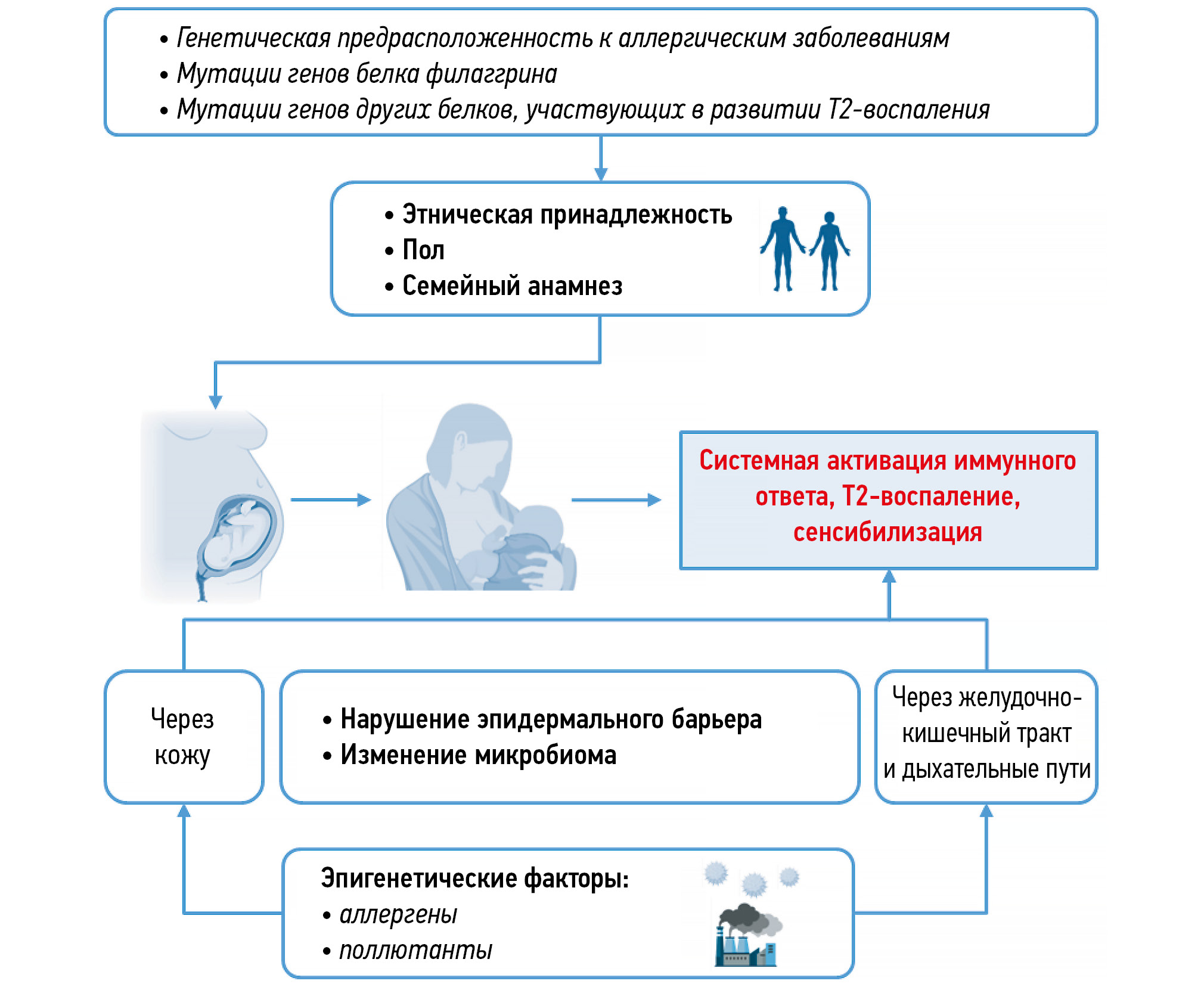 В настоящее время определены комплексные генетические нарушения при АтД, вместе с тем выявление ассоциаций генетических вариантов с клиническими проявлениями заболевания представляет определённые сложности. Выделяют генетические варианты, которые влияют на функции эпидермального барьера, включая мутации гена филаггрина [29–31], генов других структурных белков и генов, кодирующих ингибиторы протеаз рогового слоя кожи [32, 33], а также варианты в генах, участвующих в регуляции врождённого и адаптивного иммунитета ― генов, кодирующих IL-4 и IL-13 [34, 35], вариантов промотера региона C-C хемокина RANTES и IL13-кодирующего региона [36], варианты генов белка STAT6, который относится к JAK-STAT (Janus Kinases ― Signal Transducer and Activator Transcription) ― сигнальной системе, реализующей цитокиновый ответ при развитии аллергических заболеваний [37], IL-31, варианты генов рецептора к IgE ― FceRI [38]; полиморфизмы генов toll-подобных рецепторов [39, 40]; генов хемокинов, активирующих регуляцию (CCL17/TARC) иммунного ответа [41] и других генов. Однако генетические факторы далеко не всегда объясняют развитие АтД: влияние экзогенных факторов вносит не менее значимый вклад в патогенез заболевания.