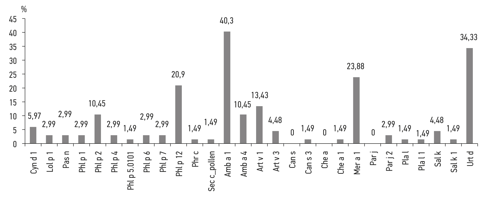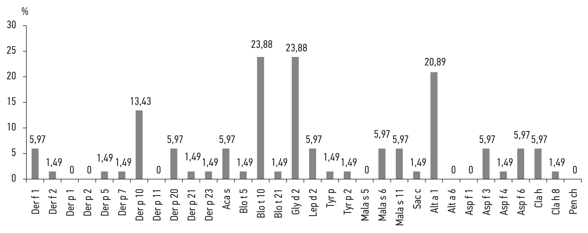 По данным проведённых нами исследований установлено, что сенсибилизацию к пыльце сорняков имели 40,3% (n=27), к домашним животным ― 32,8% (n=22), к пыльце деревьев ― 32,8% (n=22), пыльце злаковых ― 26,9% (n=18), фруктам и утероглобину ― по 47,8% (n=32), к плесени и дрожжевым грибам ― 44,8% (n=30), липокалину ― 38,8% (n=26) детей. Немного реже встречалась аллергия к профилину ― 14,9% (n=10), латексу ― 13,4% (n=9), пылевым и амбарным клещам ― 23,9% (n=16), орехам и семенам, домашнему скоту, белкам суперсемейства PR-10 (pathogenesis-related proteins), сывороточному альбумину ― по 19,4% (n=13), бобовым культурам и молоку ― по 14,9% (n=10). Гораздо реже регистрировалось наличие сенсибилизации к яйцу, рыбе и морепродуктам, мясу домашних животных и насекомых, запасным белкам ― по 13,4% (n=9), к злакам, овощам, белкам-переносчикам липидов (lipid transfer proteins, LTPs), к специям, муравью, пчеле, осе, таракану, парвальбумину, тропомиозину, аргининкиназе ― по 6% (n=4), к перекрёстно-реактивным углеводным детерминантам (cross-reactive carbohydrate determinants, CCD) ― 3% (n=2); табл. 1.