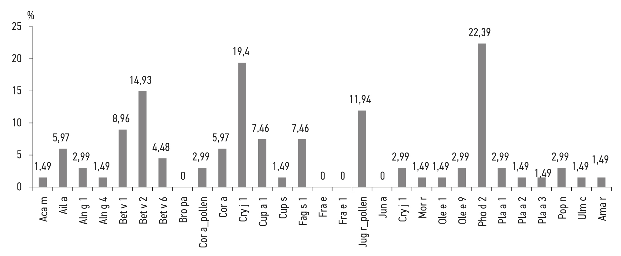 Анализ частоты сенсибилизации к аллергокомпонентам пыльцы деревьев показал, что наиболее часто среди обследованных больных отмечалась сенсибилизация к аллергену финиковой пальмы Pho d 2 (22,39%), криптомерии японской (19,4%), пыльце грецкого ореха (11,94%), в то время как истинную аллергию к пыльце берёзы (положительный компонент Bet v 1) имели только 6 (8,96%) больных (рис. 2), при этом аллергокомпонент Bet v 2 был положительным у 10 (14,93%) детей. Принимая во внимание тот факт, что данная молекула относится к белкам-профилинам, можно говорить о высокой вероятности наличия перекрёстной реактивности у этих пациентов.