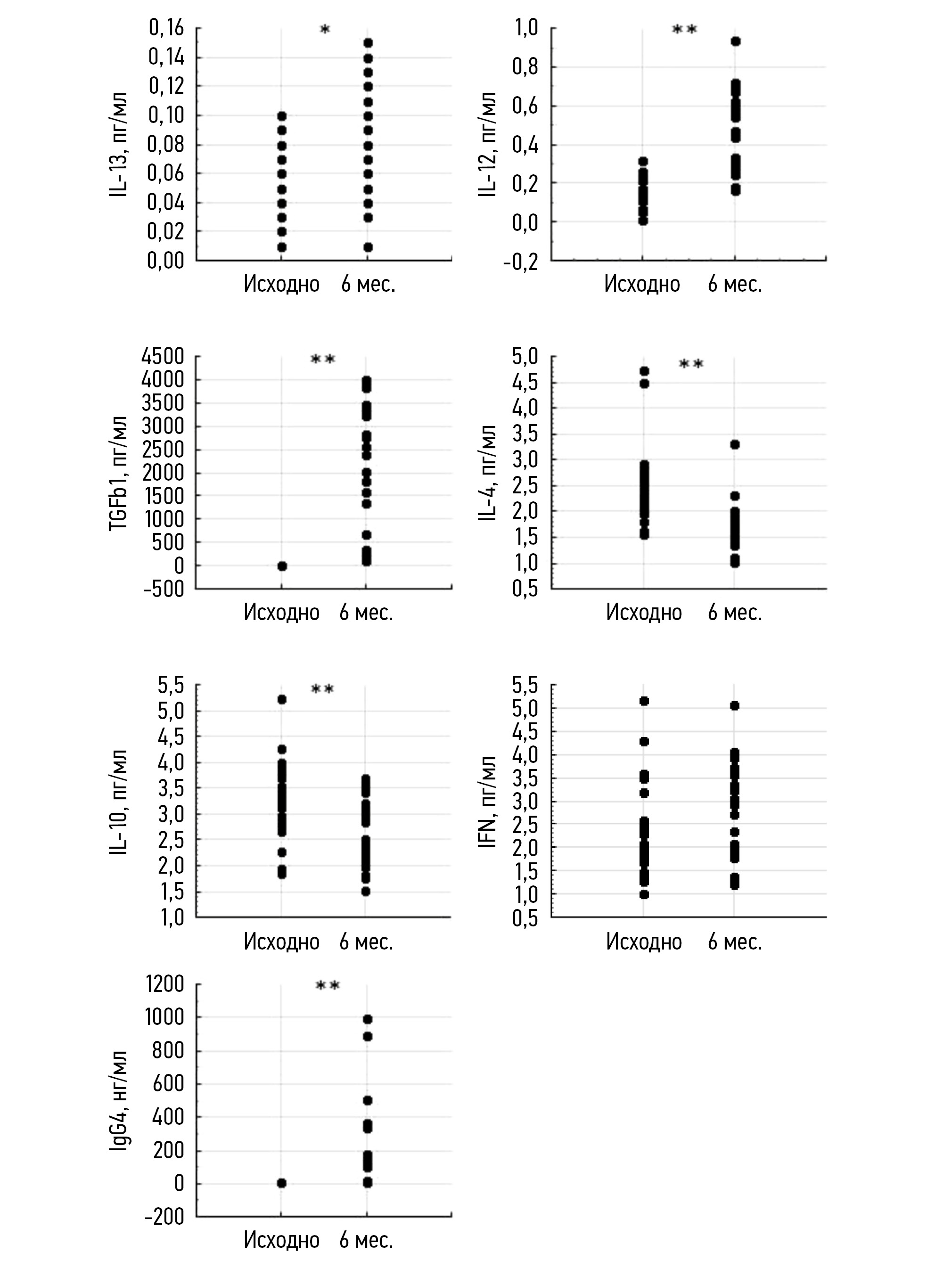 Рис. 1. Динамика цитокинового профиля и asIgG4. (Статистическая значимость рассчитана с использованием критерия Вилкоксона. Критический уровень значимости при проверке статистических гипотез в исследовании принимали равным 0,05: * p <0,001 и ** p <0,0001).