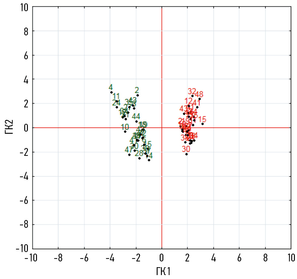 В дополнение к корреляционному анализу для решения поставленных задач нами был применён метод главных компонент. Интерпретация МГК-модели проводилась одновременно по двум графикам — счетов (координаты наблюдений) и нагрузок (координаты переменных) — в пространстве главных компонент (рис. 2). Так, кластер красного цвета представляет собой наблюдения до назначения АСИТ, а кластер зелёного цвета — спустя 6 месяцев от начала инициации иммунотерапии. Подобное расположение кластеров по разные стороны от начала координат свидетельствует о значимом изменении изучаемых параметров у наблюдаемых пациентов в процессе проведения АСИТ.