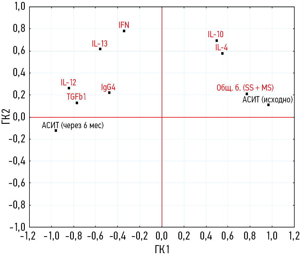 Вторая главная компонента (ГК2) перпендикулярна первой и, следовательно, свидетельствует об отсутствии связи отдельных изучаемых параметров с проводимой АСИТ. Так, значения IFN-γ, имеющие максимальную нагрузку на эту ось, можно считать не изменяющимися в процессе лечения. В свою очередь переменные, характеризующие уровни IL-10, IL-13 и IL-4, имеют перекрёстные нагрузки на обе главные компоненты, что свидетельствует о меньшей степени влияния изменений уровня указанных цитокинов на результат лечения. Наименьшую нагрузку на обе главные компоненты (ГК1 и ГК2) имеет asIgG4, из чего следует, что повышение указанного параметра не столь значимо влияет на исход лечения пациентов с аллергическим ринитом через 6 месяцев от начала АСИТ. Кроме того, можно отметить, что близкое взаимное расположение на графике нагрузок таких пар цитокинов, как IL-10 и IL-4, а также IL-12 и TGF-β, свидетельствует об их положительной корреляции.