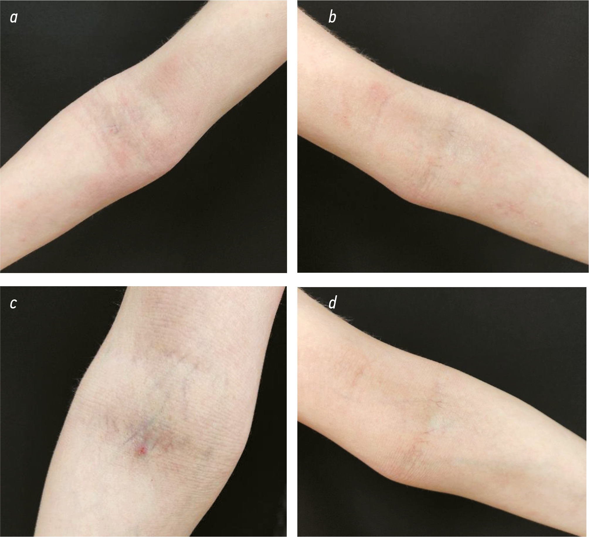 Рис. 1. Пациентка К., 17 лет, с диагнозом атопического дерматита среднетяжёлого течения: а, b (исходно) ― на коже верхних конечностей эритематозно-сквамозные очаги с инфильтрацией красного цвета, выраженные очаги лихенизации; c, d (28-й день лечения) ― значительное уменьшение выраженности участков гиперемии, инфильтрации и шелушения; слабовыраженная лихенизации в области локтевых сгибов.