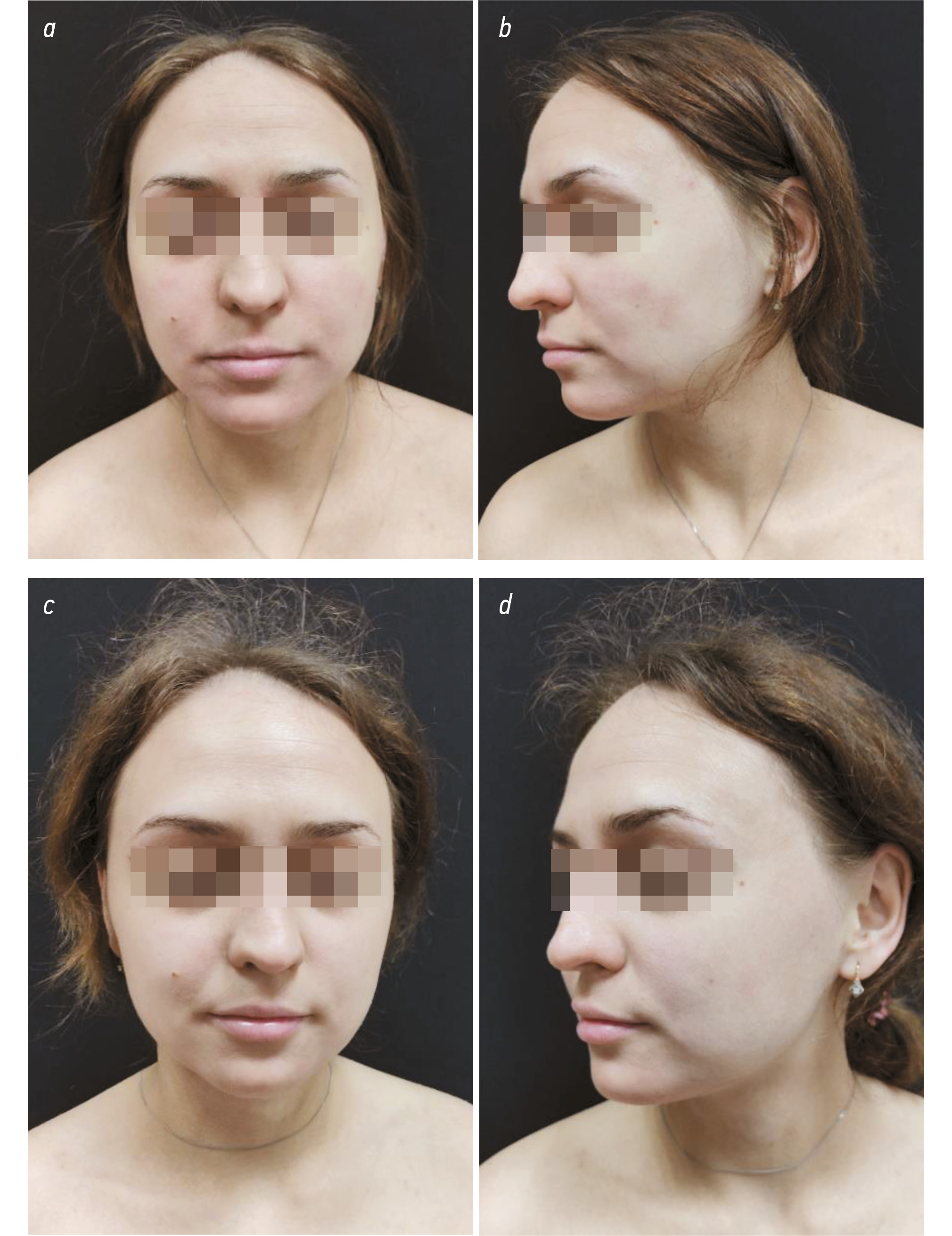 Fig. 2. Patient M., 21 years old, diagnosed with moderate to severe atopic dermatitis: а, b ― erythematous-squamous plaques with infiltration and pale skin areas over the face on the baseline; c, d ― skin on the 28th day of treatment, hyperemia, infiltration, and scaling has significantly decreased.
