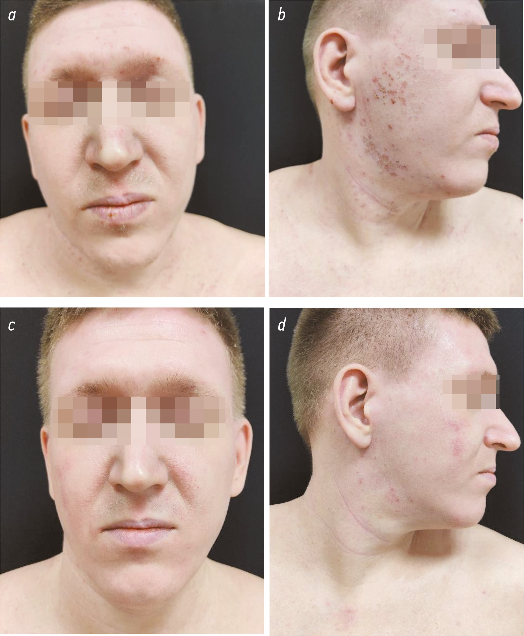 Рис. 3. Пациент Н., 28 лет, с диагнозом атопического дерматита тяжёлого течения, диффузная форма: а, b (исходно) ― на коже лица разлитая гиперемия с инфильтрацией и обильным мелкопластинчатым шелушением, множественные линейные и прерывистые экскориации, покрытые серозно-геморрагическими корками, поверхностные трещины; c, d (28-й день лечения) ― значительное (но не полностью) уменьшение гиперемии, инфильтрации и шелушения, большинство экскориаций и трещин эпителизировались без признаков рубцевания.