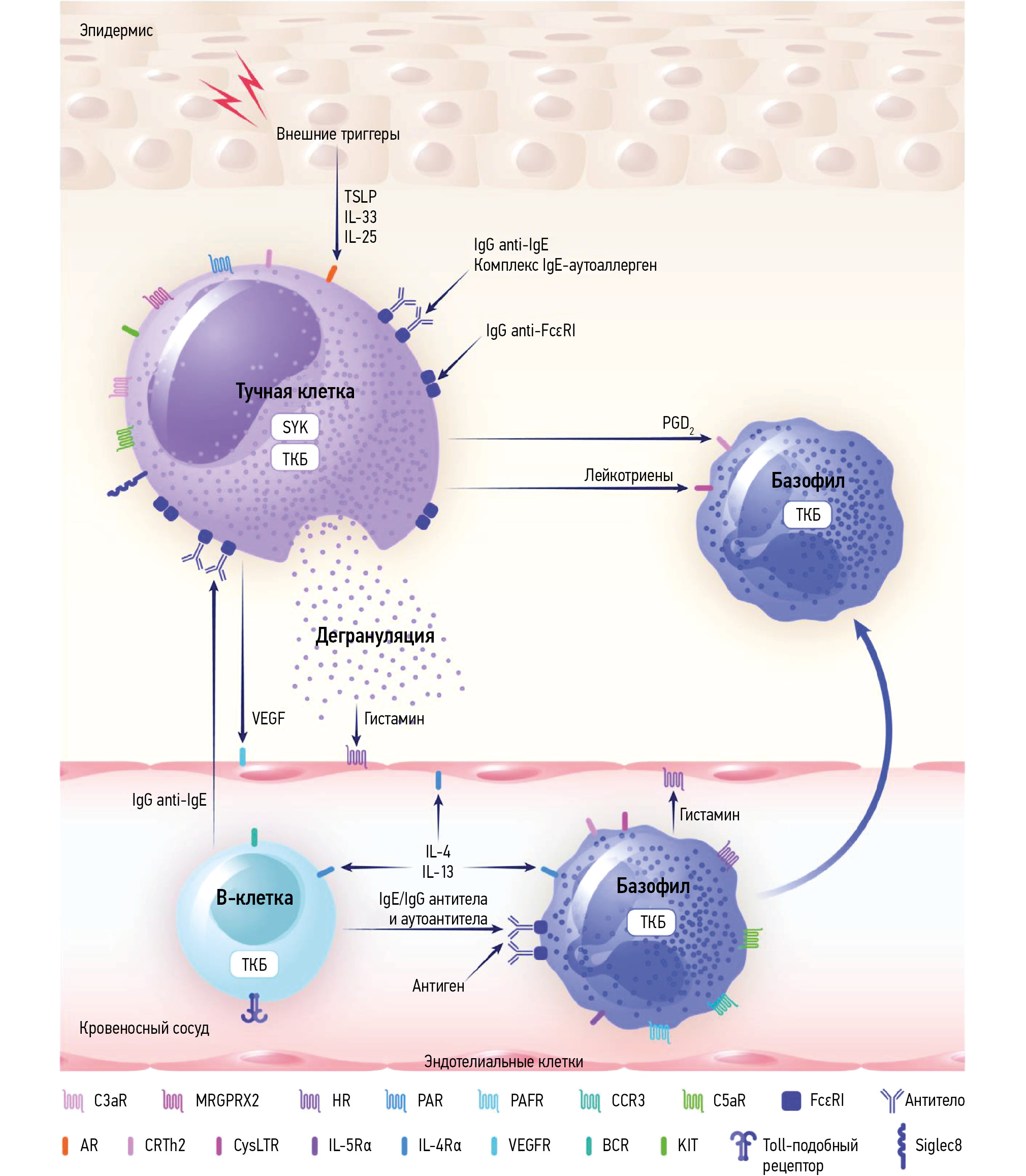 Взаимодействие иммунных клеток при ХСК подразумевает также участие В-клеток, отвечающих на повышение уровня цитокинов усилением пролиферации, сменой класса синтезируемых антител, продукцией аутоантител, что ещё более активирует тучные клетки и базофилы [24, 26]. Доказательством значимости В-клеток в патогенезе заболевания служит очевидная, по данным ряда публикаций, эффективность применявшейся вне разрешённых показаний анти-В-клеточной терапии (ритуксимаб, циклофосфамид) у пациентов с ХСК [33–36]. Таким образом, активация тучных клеток и базофилов приводит к развитию симптомов ХСК, а потенциальное участие аутоантител против FcεRI предполагает решающую роль В-клеток в патогенезе заболевания.