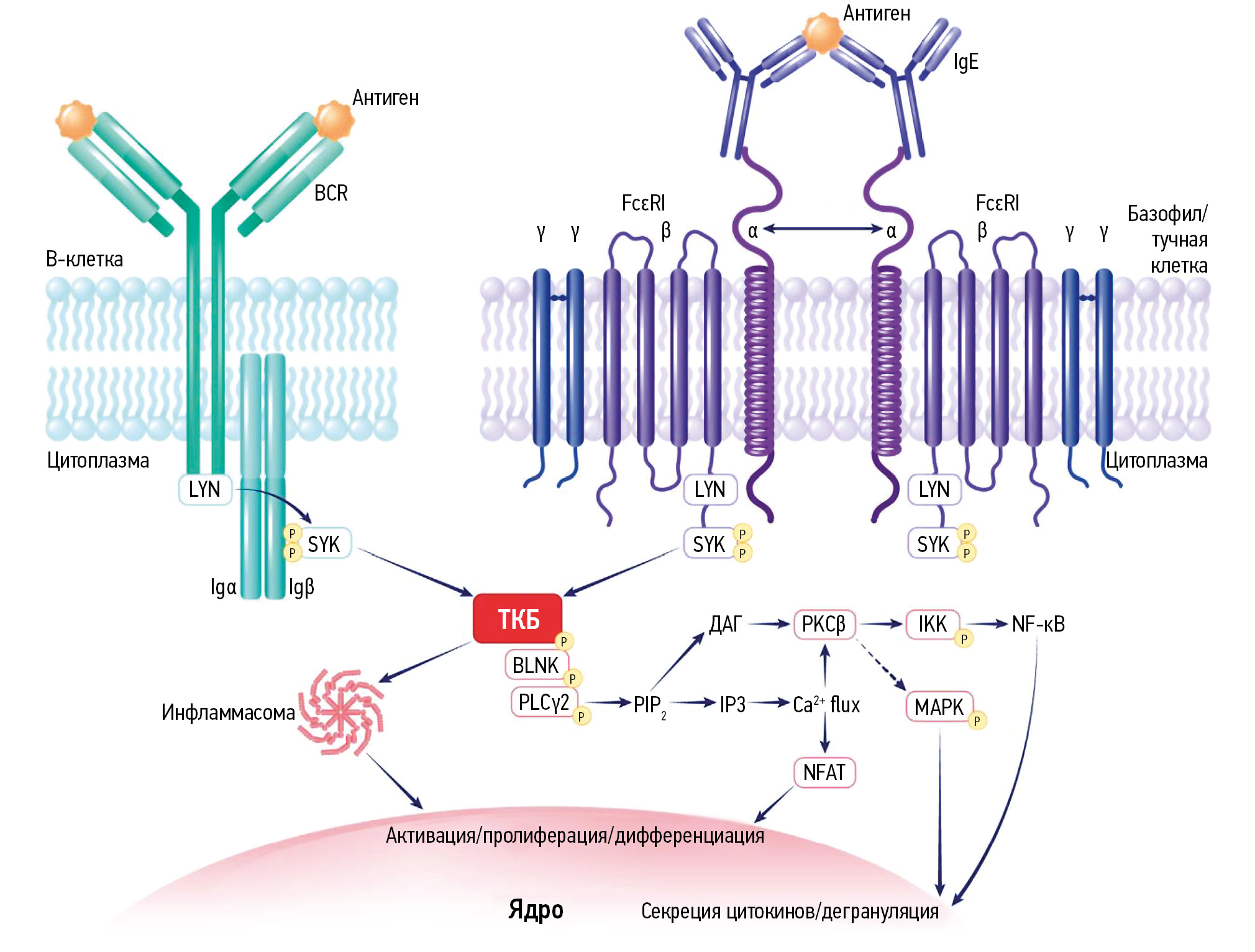 ТКБ является основным компонентом сигнальных путей целого ряда рецепторов, включая B-клеточный (B-cell receptor, BCR), toll-подобный рецептор (toll-like receptor, TLR), хемокиновый рецептор, Fc-рецептор, а также служит регулятором активации NLRP3 (NLR-family pyrin domain-containing protein 3) инфламмасомы [41–44]. ТКБ в базофилах и тучных клетках играет решающую роль в интеграции сигналов преимущественно через FcεRI рецептор [37]. Активация ТКБ предполагает фосфорилирование её двух регуляторных тирозиновых остатков — Y551 и Y223 [45]. β- и γ-цепи рецептора FcεRI, или гетеродимер Igα/Igβ, который нековалентно связан с BCR, подвергаются фосфорилированию тирозинкиназой LYN после активации рецепторов FcεRI или BCR; в свою очередь этот процесс создаёт места пристыковки и активирует тирозинкиназу SYK (spleen tyrosine kinase) (см. рис. 2) [42, 46]. ТКБ транслоцируется к мембране клетки, где SYK или протоонкоген тирозин-протеинкиназа семейства SRC фосфорилируют Y551 в петле активации [44, 46–48]. Далее ТКБ аутофосфорилируется в Y223 домена SH3, что привлекает адаптерные белки — SH2-доменсодержащий лейкоцитарный протеин (SLP-76) или линкерные белки BLNK (B-cell linker protein) [44, 47], что, в свою очередь, приводит к фосфорилированию фосфолипазы PLCγ2 (phospholipase C gamma 2) [44]. Активированная фосфолипаза PLCγ2 продуцирует инозитол-3,4,5-фосфат (ИФ3) и диацилглицерин (ДАГ) [44]. Далее инозитол-3,4,5-фосфат (ИФ3) активирует кальциевые каналы, позволяя перемещение ядерному фактору активированных Т-клеток NFAT (nuclear factor of activated T cells) в ядро клетки, а ДАГ активирует протеинкиназу Cβ, что приводит к экспрессии ядерного фактора NF-κB [49].
