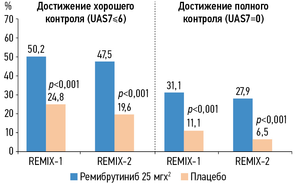 Рис. 3. Доля пациентов, достигших хорошего и полного контроля крапивницы к 12-й неделе в исследованиях ремибрутиниба REMIX-1 и REMIX-2 [86].
