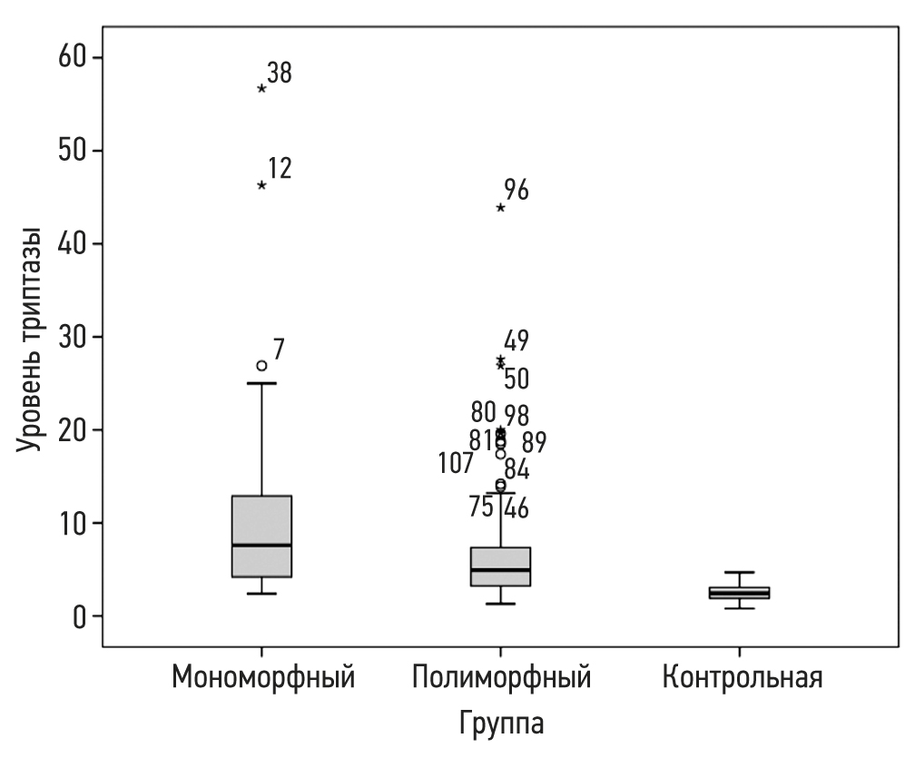 При сопоставлении содержания триптазы в сыворотке крови пациентов всех исследуемых групп выявлены достоверные различия концентрации фермента между группами пятнисто-папулёзного кожного мастоцитоза (мономорфный тип пятнисто-папулёзного кожного мастоцитоза, моноППКМ; полиморфный тип пятнисто-папулёзного кожного мастоцитоза, полиППКМ) и контрольной группой (р=0,05). Медианный уровень триптазы у всех детей с пятнисто-папулёзным кожным мастоцитозом без деления на подтипы составил 8,7 мкг/л (диапазон 1,3–57,0 мкг/л). Наиболее выраженные различия отмечались между показателями уровня фермента у детей с моноППКМ ― Ме 10,9 (диапазон 2,84–46,3 мкг/л) и в контрольной группе (р=0,01). Значения Ме 6,1 (диапазон 1,3–57,0 мкг/л) у детей с полиППКМ также были достоверно выше, чем в контрольной группе (р=0,05).