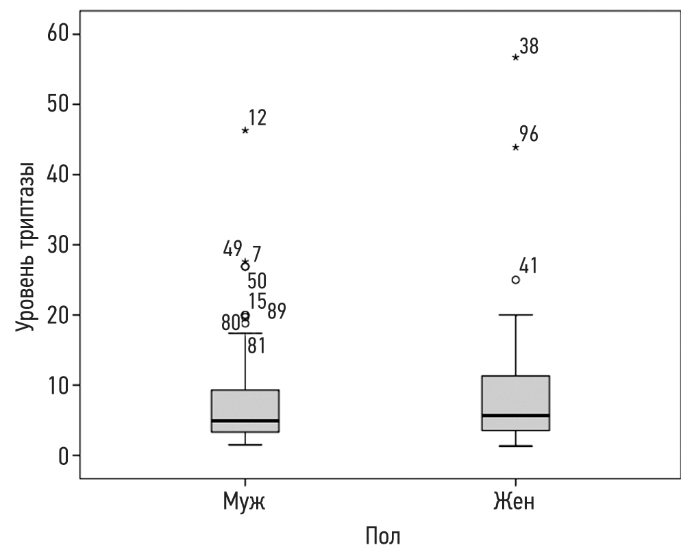 Рис. 2. Сравнительные показатели уровней триптазы в сыворотке периферической крови (мкг/л) у мальчиков (n=65) и девочек (n=55) с пятнисто-папулёзным кожным мастоцитозом.