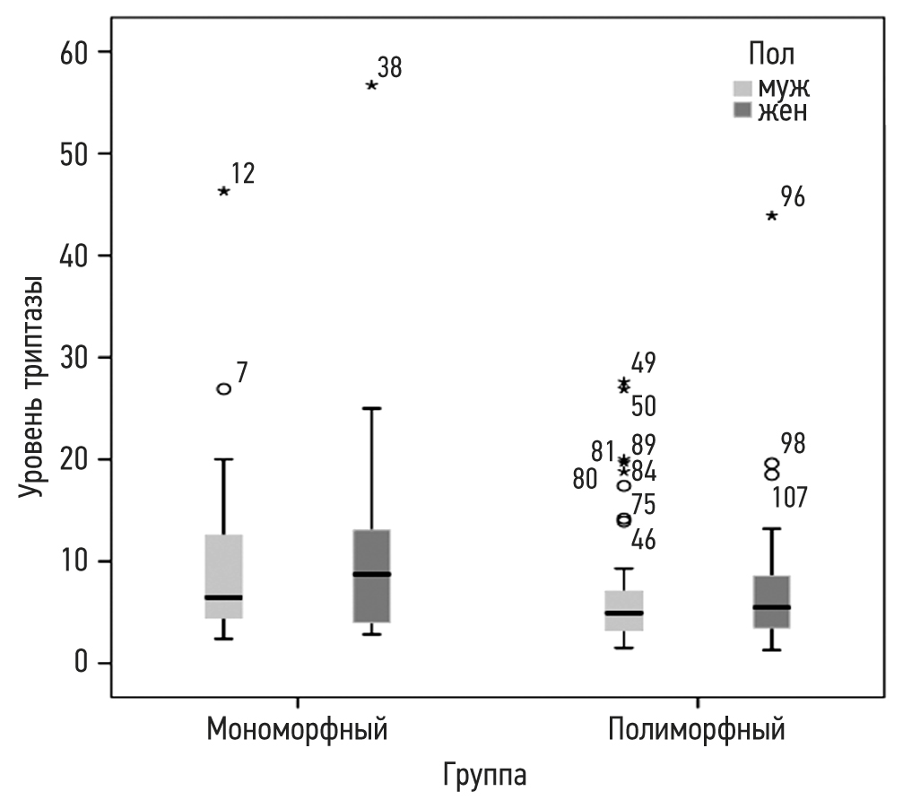Рис. 3. Сравнение уровней триптазы в сыворотке крови (мкг/л) в группах пациентов с моно- и полиморфным типом пятнисто-папулёзного кожного мастоцитоза в зависимости от пола.