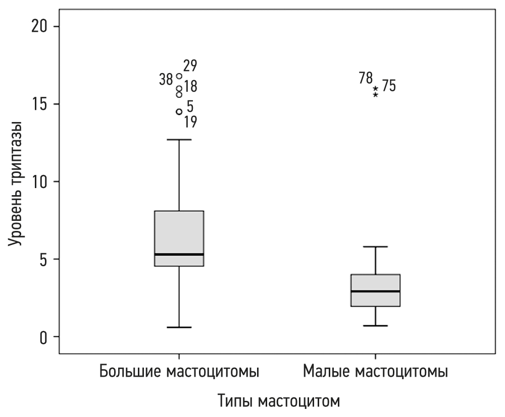 У пациентов с большими мастоцитомами уровни триптазы достоверно отличались от значений у детей с малыми мастоцитомами: Ме 8,4 мкг/л [4, 6; 14, 5] против Ме 3,8 мкг/л [1, 9; 4, 2] соответственно.